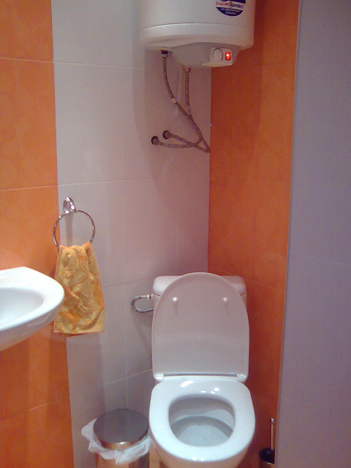 Здравейте, след направеният ремонт на банята реших и аз да кача някоя снимчица. Банята е с размери 1,90м дължина на 1,10м широчина. Реших да рискувам с оранжевият цвят комбиниран с белите мивка, моноблок, бели плочки и бял таван. Съчетанието с хромираните смесители, казанчета, аксесоари и лунички в крайна сметка доста ми хареса. Плочките са лепени върху гипсокартон, който е окачен. Вратата е бяла алуминиева. Сумата която заплатихме за банята + смяна на тръбите ( ППР) и смяна на тръбите на мръсният канал е около 2000 лева. Едната стена я преместих с 20 сантиметра за да я разширя.