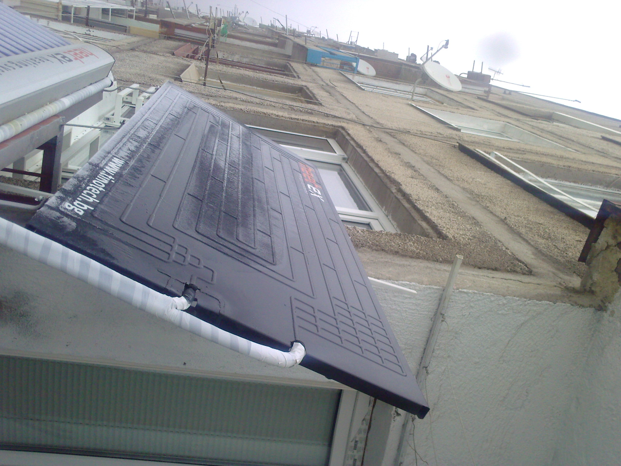 Както се казва да, да ама не. При външна да речем -2С, темп на панела +8С, това няма да доведе до "съответно вдигане темп. на кондензация, отделената мощност", а ще доведе до ЗАГУБА НА ТОПЛИНА от конвективен топлообмен на панела с околната среда, от порядъка на 3,2х11х10=352W. Ако това става към 12:54h - имаш топлоприток от сл. радиация от порядъка на 344х1,6=551W, това е в супер идеалния - теоретичния случай, при използване на следяща система и супер абсорбиращ панел, който още не е измислен, да не говорим за произведен. Та като извадиш 551W - 352W = 199W - прекалено малко за 390лв реално вложение. А като се скрие слънцето...?