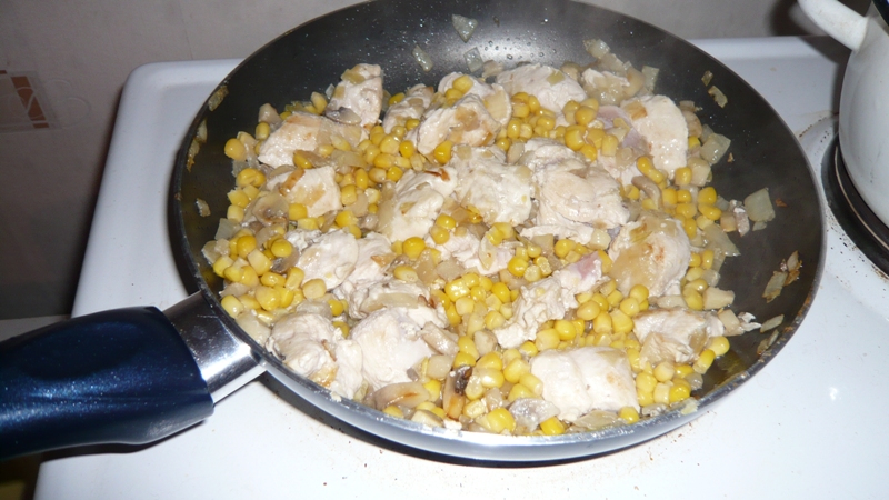 Нарязваме на ситни кубчета лука и гъбите.След което ги задушаваме в мазнината.После добавяме и пилешкото филе,предварително нарязано на кубчета заедно с царевицата,пилешкия бульон,черния пипер и бялото вино.Задушаваме около 15 минути.Изключваме котлона и прибавяме заквасената сметана.Разбъркваме и готова смес исипваме в малка тавичка.Добавяме топеното сирене и настъргваме от горе кравето сирене.Запичаме в предварително загрята фурна около 15 минути.Не се добавя сол.Пилешкия бульон осолява достатъчно ястието.Поднасясе с чаша бяло вино.