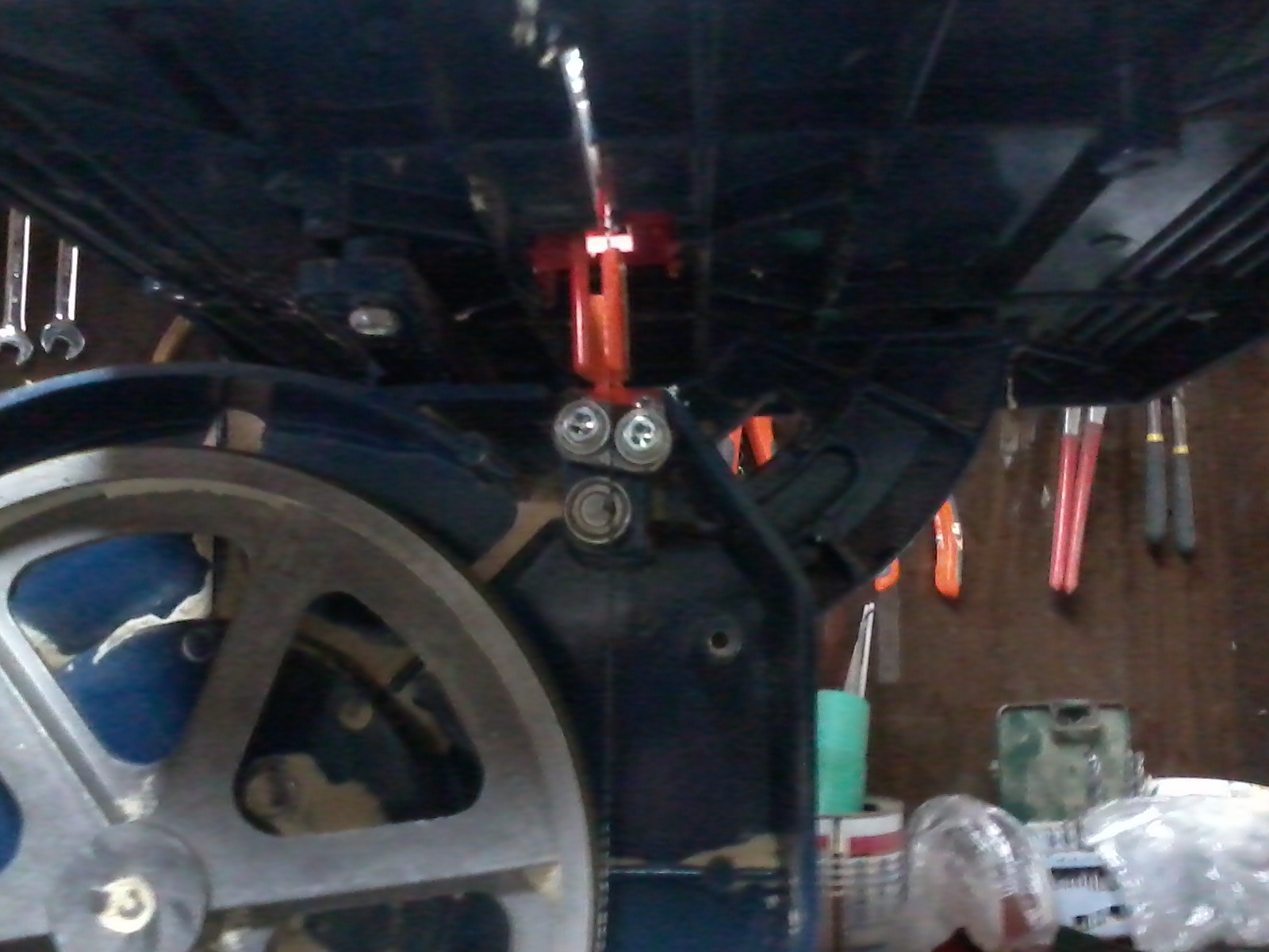 Малко дълго обяснение се получи , та за яснота ето и две снимки.На втората снимка не съм монтирал още оригиналния лагер, който подпира лентата от към гърба. И си личи как лентата се вряза в метала. Утре по светло ще снимам и паралелния водач за водене на материала, пак направи си сам. :)