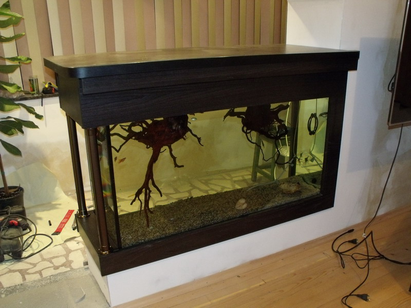 Начи плота е изкъствено одебелен за да не тежи много на механизмите че стана бая голям и тежък, самите механизми са съчмени с пълно изтегляне, материала е ПДЧ. Изрязах два детайла на буквата П и ги хванах с парче от материала което ся е между стената и аквариума, отсреща направих конструкция която да стъпи здраво, тръбите си бяха идея на клиента а и самата идея а аз трябваше да я реализирам, тия тръби крепят почти цялата конструкция. Алуминиевата рамка си бе направена вече и идеята и бе да се захванат лампите, но пък я хванахме за материала и заздравихме конструкцията. Стана добре, направих каквото искаше човека, тия неща са от ония които може би докато се занимавам с това няма да го направя повторно.