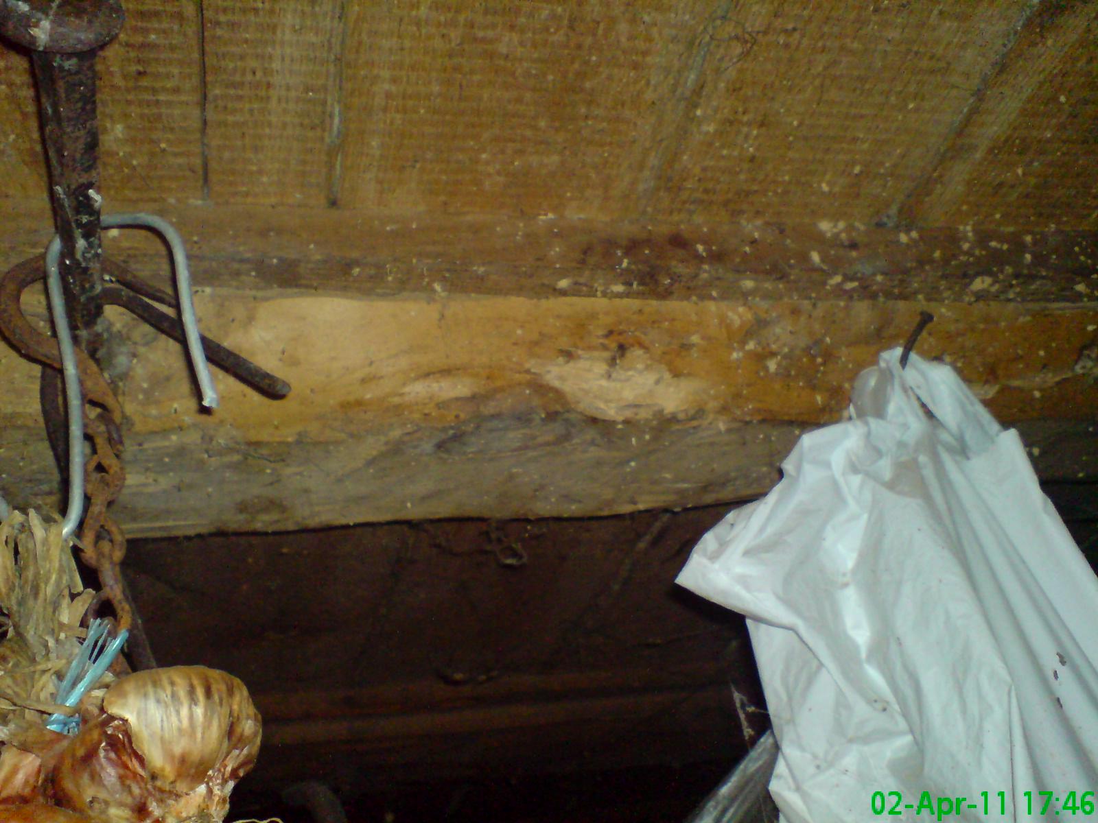 Първото което ме притеснява - гредите между 1 и 2ри етаж са от топола а не мога да преценя какво е състоянието им във 2 от стаите тавана е измазан а в мазето където не е личат едни ситни дупчици по тях. едната е леко цепната друга в средата пак на дупчици и от скоро е изязал жълт прашец сякаш съвсем скоро е ядено от нещо, другите изглеждат нормално май.