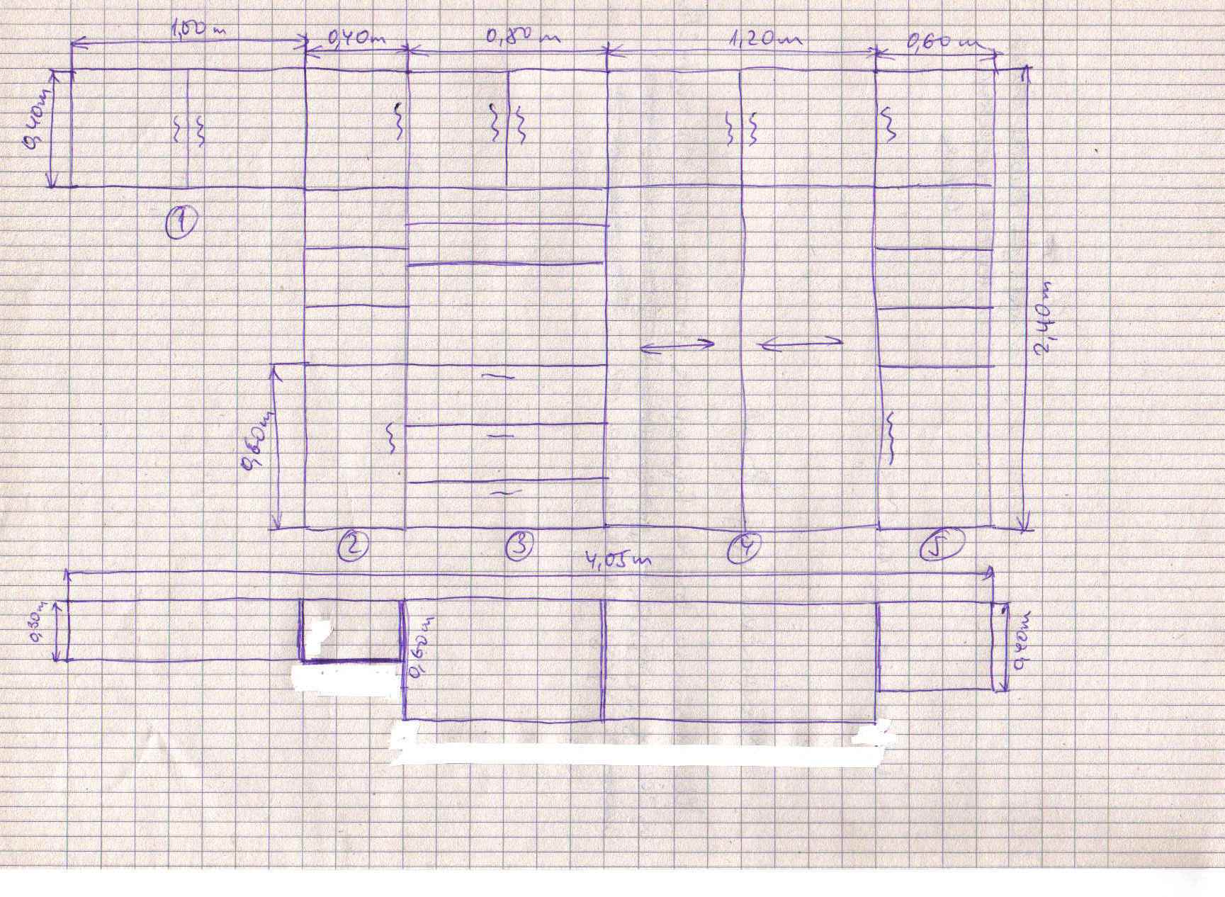 2 и 5 - колонки с шкафчета отгоре и отдолу, а по средата полички. По- тесни са, за да има подход към вратите. 5 - остава зад вратата към терасата.