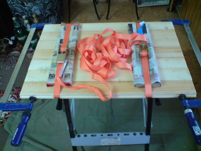 Лепих го с Ц200 и след това стягах с колани за багаж, лепилото стяга за около 2 часа, но го държах цяла вечер стегнато. Напречните летви също лепих, винтове и лепило сложих само на гърба и после ги китвах. нарочно ги вкопах за да стане здраво и да не се измята от слънцето плота.