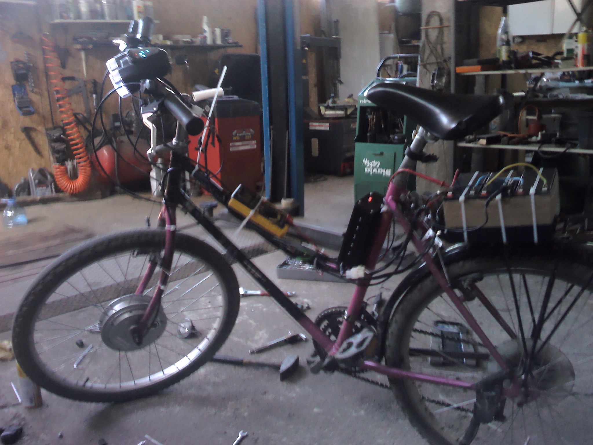 Това беше първоначалната концепция, колкото да го покарам 1 ден. Сега е доста по-различно променена рамка и с добавени мигачи, стоп и друга дръжка за газта. Кефа е голям, а пък ако дигаше 50км/ч щеше да е брутално, завиждам на колегата с двата мотора по 1000W.