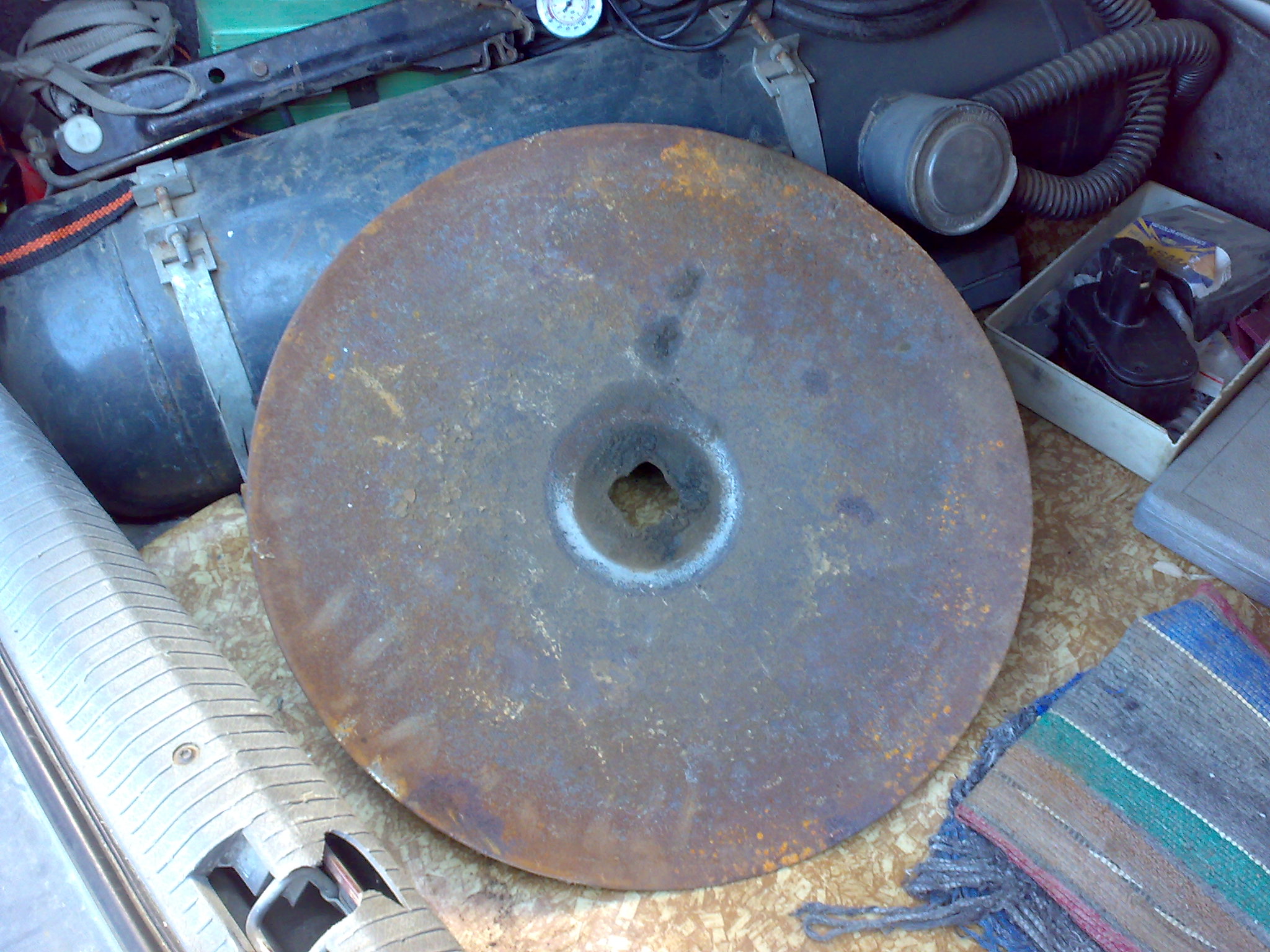 Вдъхновен от едни снимки пуснати от filmatoplo в ,,Готварство,туршии и зимнина"реших и аз да си направя това чудо на чревоугодничеството.Изработката не е сложна-нужен е най-вече диск от дискова брана,малко железарии за крака и дръжки,ъглошлайф,електрожен и др.дребни инструменти.За сега пускам снимки на диска/току що ми го донесоха и вече е в багажника на колата/.Диаметър - 510 мм,дебелина при отвора - 6 мм.Инструмента ми е на село и затова ще продължа след неделя.Междувременно ако някой има идеи за по-добър вариант нека сподели.Макар, че по-добър от ,,мерцедеса" на приятеля на filmatoplo от офроуд форума аз не видях.Да се има в предвид, че съм изчел всички 19 страници от тяхната тема-,,Тиган или барбекю".