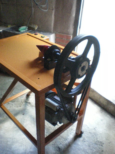 iavor написа: ... Другият недостатък е подаването с ръка.На няколко пъти дървото се завърташе и имам лош спомен,,,счупен пръст. Затова направих изменение на машината като монтирах подавач / ако може така да се нарече / и сега няма опасност от сакатлъци. На снимките е стария вариант и ако имате интерес ще пусна снимки и от новият,подобрен вариант. ....Колега, от снимката забелязвам няколко недостатъка. Конуса ми се вижда малко къс на дължина. И е поставен много високо от плота - затова дървото се завърта. Моя конус отстои на около 5 мм от плато в най-дебелата си част. Стъпката е 8 мм. Двигателя, ако е монофазен 2,2 kW, е наистина слаб. Моя е трифазен, 2,5 kW, и 1450 об/мин. Оборотите на конуса са 500 об/мин. Подаването и аз съм го направил с лостов механизъм за по-лесно подаване. Конструкцията ти е подобна на моята.