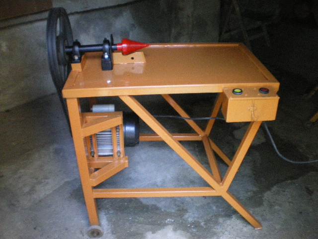 iavor написа: ... Другият недостатък е подаването с ръка.На няколко пъти дървото се завърташе и имам лош спомен,,,счупен пръст. Затова направих изменение на машината като монтирах подавач / ако може така да се нарече / и сега няма опасност от сакатлъци. На снимките е стария вариант и ако имате интерес ще пусна снимки и от новият,подобрен вариант. ....Колега, от снимката забелязвам няколко недостатъка. Конуса ми се вижда малко къс на дължина. И е поставен много високо от плота - затова дървото се завърта. Моя конус отстои на около 5 мм от плато в най-дебелата си част. Стъпката е 8 мм. Двигателя, ако е монофазен 2,2 kW, е наистина слаб. Моя е трифазен, 2,5 kW, и 1450 об/мин. Оборотите на конуса са 500 об/мин. Подаването и аз съм го направил с лостов механизъм за по-лесно подаване. Конструкцията ти е подобна на моята.