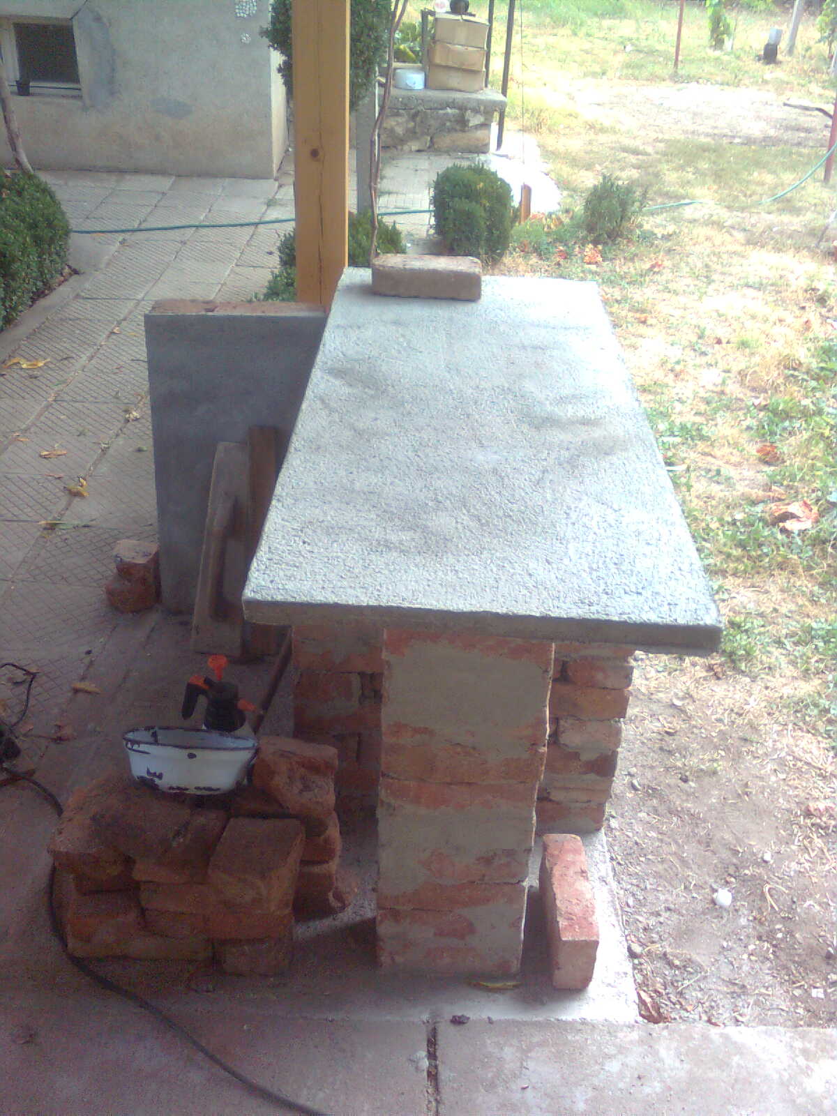Имам на село в двора един навес от около 16-18кв.м и под него имах свободно пространство от 1,5кв.м. и рекох,че тук ще е моето барбекю. Навързах арматура Ф8 и отлях плоча с размер 1.10 на 1,40см. Стегна се бетона и започнах със стари еденични тухли. Първо наредих няколко реда тухли, без да ги лепя за да видя и измисля разни варианти. Спрях се на един и започнах да зидам.Използвах лепило за плочка върху плочка тип Ц1. и като за начало се получи това: Иззидах и една подпора за да легне на нея единия край на плочата която отлях на цимент и я вдигнах след това.,. В самата плоча има арматура Ф4. След това наредих пак тухли за да видя как ще изглежда.Хареса ми и продължих.А котката явно усещаше какво ще се пече вътре и немърдаше от мен.