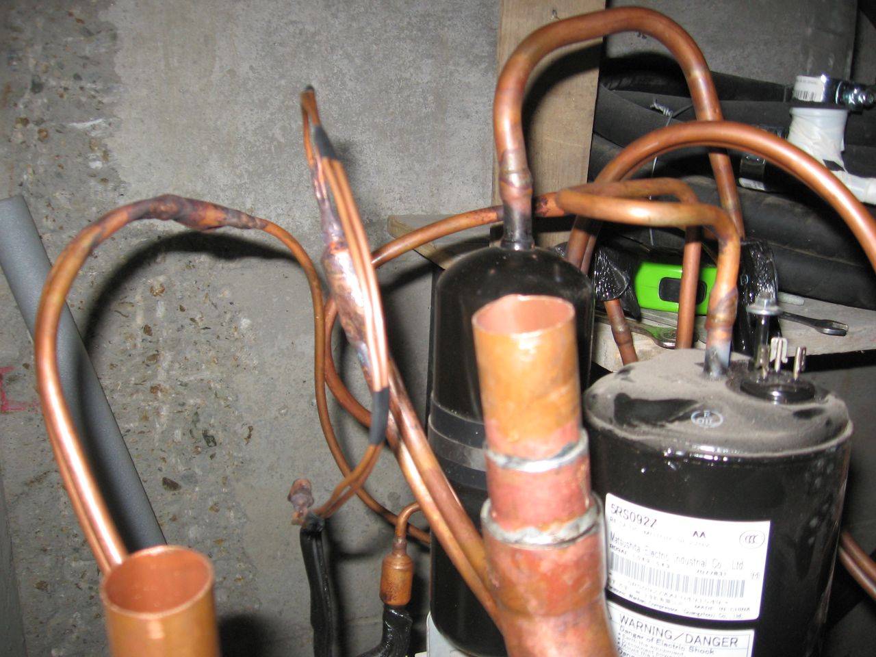 При замяната на топлообменниците(ТО) се изпуска фреона и след монтирането на новите се напълва по табелка. ТО са тръбни, и са сметнати така,че вътрешния им обем да отговаря на този на премахнатите ТО. Използвах стандартна тръба 9.5мм ( 3/8) с разклонение ( по две в паралел ). Махнах 4-пътния вентил и замених капилярката с две паралелни за по-голяма пропускливост( предишния климатик ,който също е завършен,но за момента не се налага да работят и двата вдигаше твърде висока температура на парите след компресора. Затова реших да увелича малко пропускливостта на дросела при този). В последствие се наложи да притворя ( премачкам ) леко едната за да напасна желаните температури.