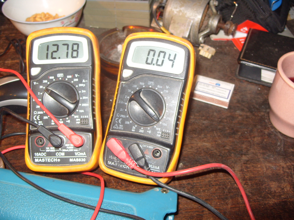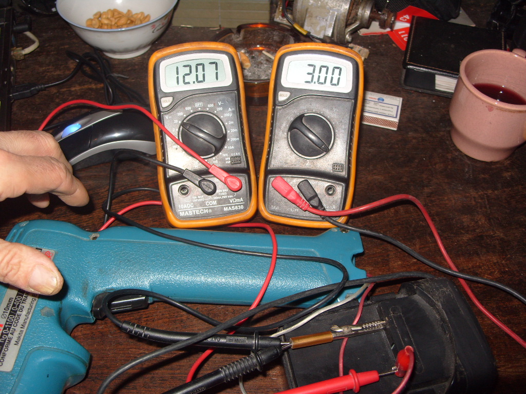 Веднага я направих установката, винтоверта е Makita 6095 D, старичък модел, но много як...работното напрежение е 9.6 В, но търпи и 12 В...захранването от акумулатор 12 В, но данните важат и за токоизправител,показанията на уредите се виждат...само ампермера в пусковия момент достига 6 Ампера, но това не успях да го хвана на снимка. Мерил съм при натоварване-около 7-8 Ампера "дърпа".