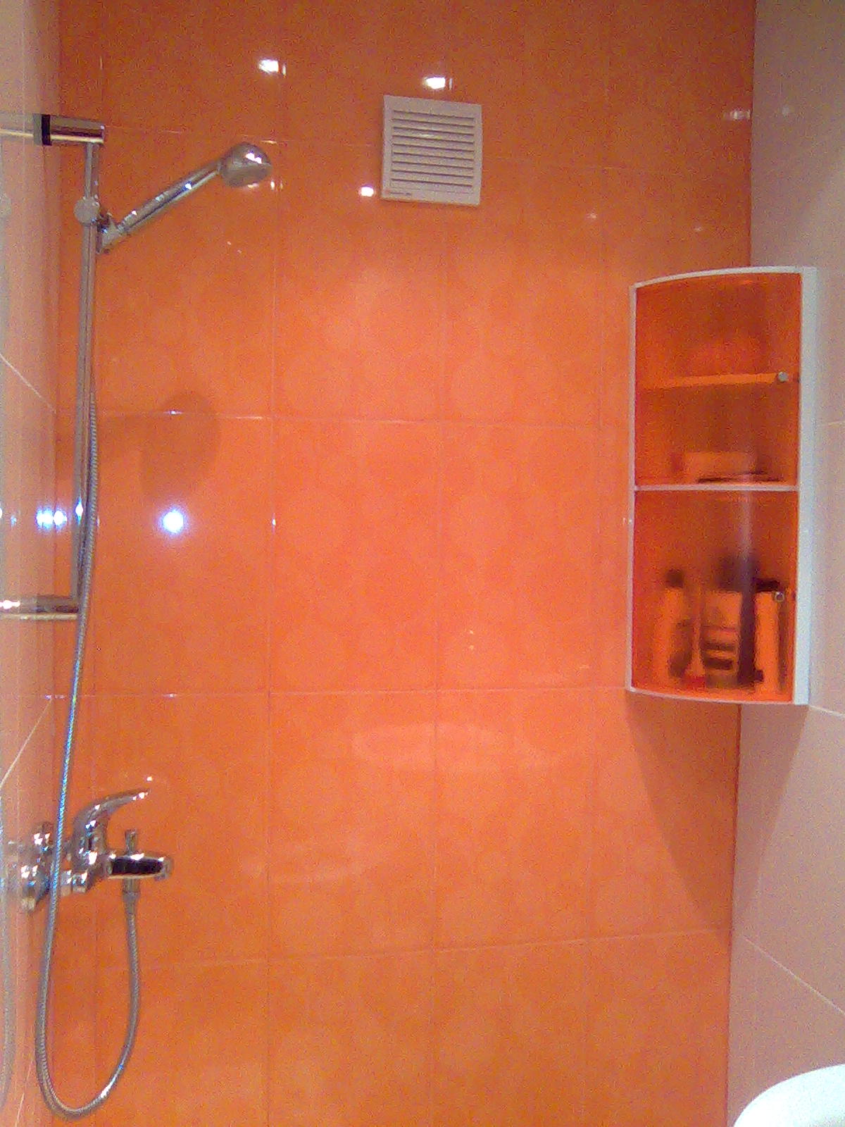 Здравейте, след направеният ремонт на банята реших и аз да кача някоя снимчица. Банята е с размери 1,90м дължина на 1,10м широчина. Реших да рискувам с оранжевият цвят комбиниран с белите мивка, моноблок, бели плочки и бял таван. Съчетанието с хромираните смесители, казанчета, аксесоари и лунички в крайна сметка доста ми хареса. Плочките са лепени върху гипсокартон, който е окачен. Вратата е бяла алуминиева. Сумата която заплатихме за банята + смяна на тръбите ( ППР) и смяна на тръбите на мръсният канал е около 2000 лева. Едната стена я преместих с 20 сантиметра за да я разширя.
