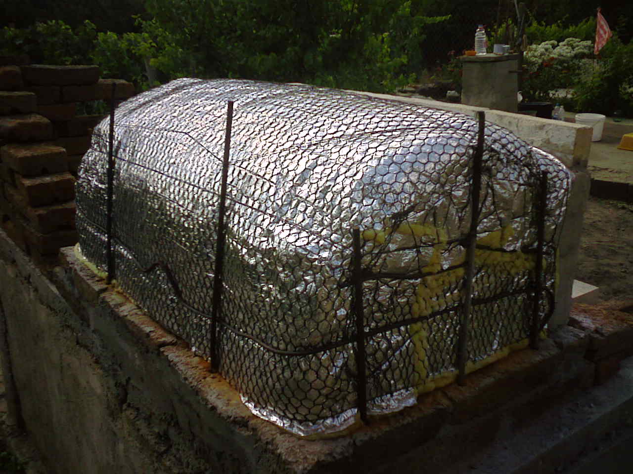 С няколко думи: избрах си кофти място, което уляга, заради някакви стари ями, а и е под наклон. Копаене, трамбоване, копаене, трамбоване... Изливни пилоти, дълги около метър, обединяваща греда, плоча за барбекюто, всичко, предварително армирано и излято наведнъж - две седмици.