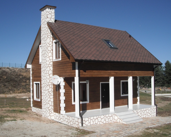 Къщичката е изцяло от фиберциментов сайдинг,цокъла и комина също от такива плоскости,имитиращи камък.