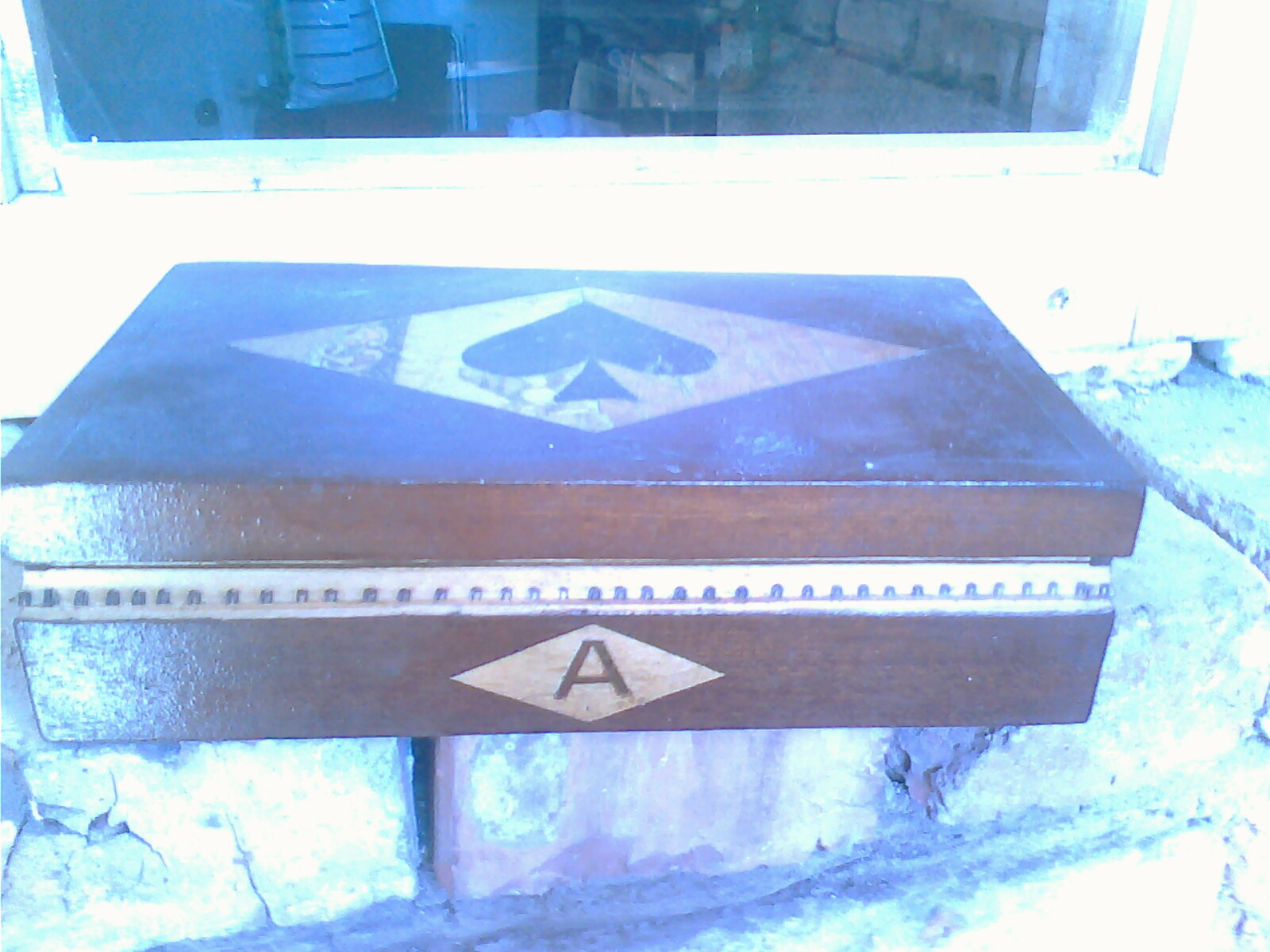 Оказа се,че е жива първата ми интарзия!Кутия за тоалетни принадлежности от казармата!Е, има белези на времето-1985г., но все пак е тя!И махагона си личи!!!