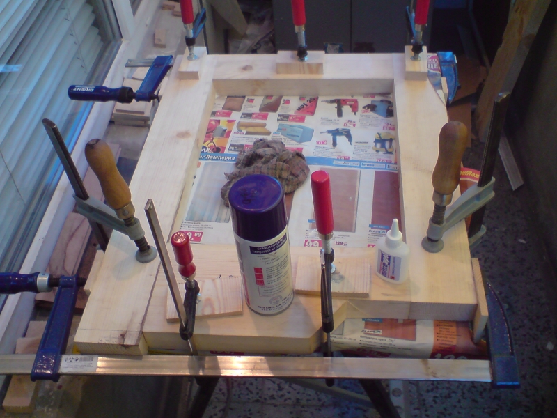 Нута го правих с плоско длето 19мм, пробити отвори на гъсто и след това с длето съединяване и точно напасване. Следваше сухо сглобяване и лепене с ц200 на Боро, с много малко отворено време за работа , дърпа много бързо за около 15мин.