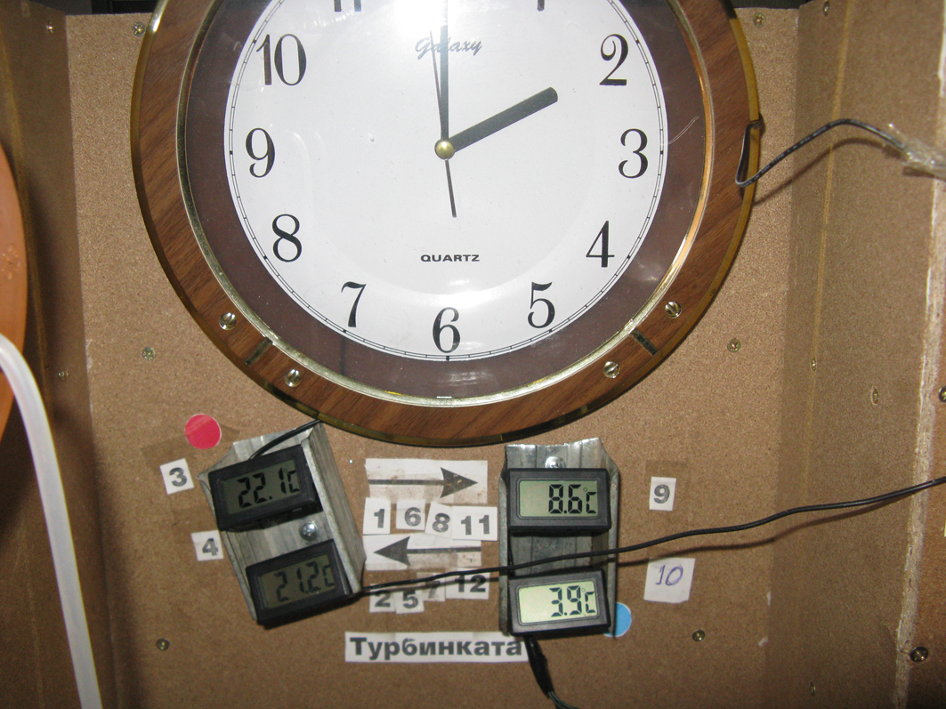 Снимка на показанията на термометрите на входовете и изходите в 30-тата минута след включването на вентилаторите.