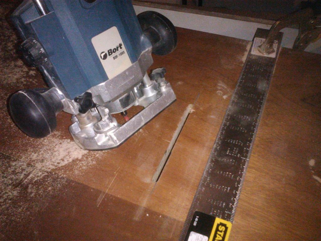 Само набързо ще кача какво натворих тази вечер. Отрязох една тънка букова летвичка и направих канал в плота с оберфрезата. Хванах с 2 види една перпендикулярна дъсчица и стана почти като купешки водач, но за сега ще работи само на 90 градуса.