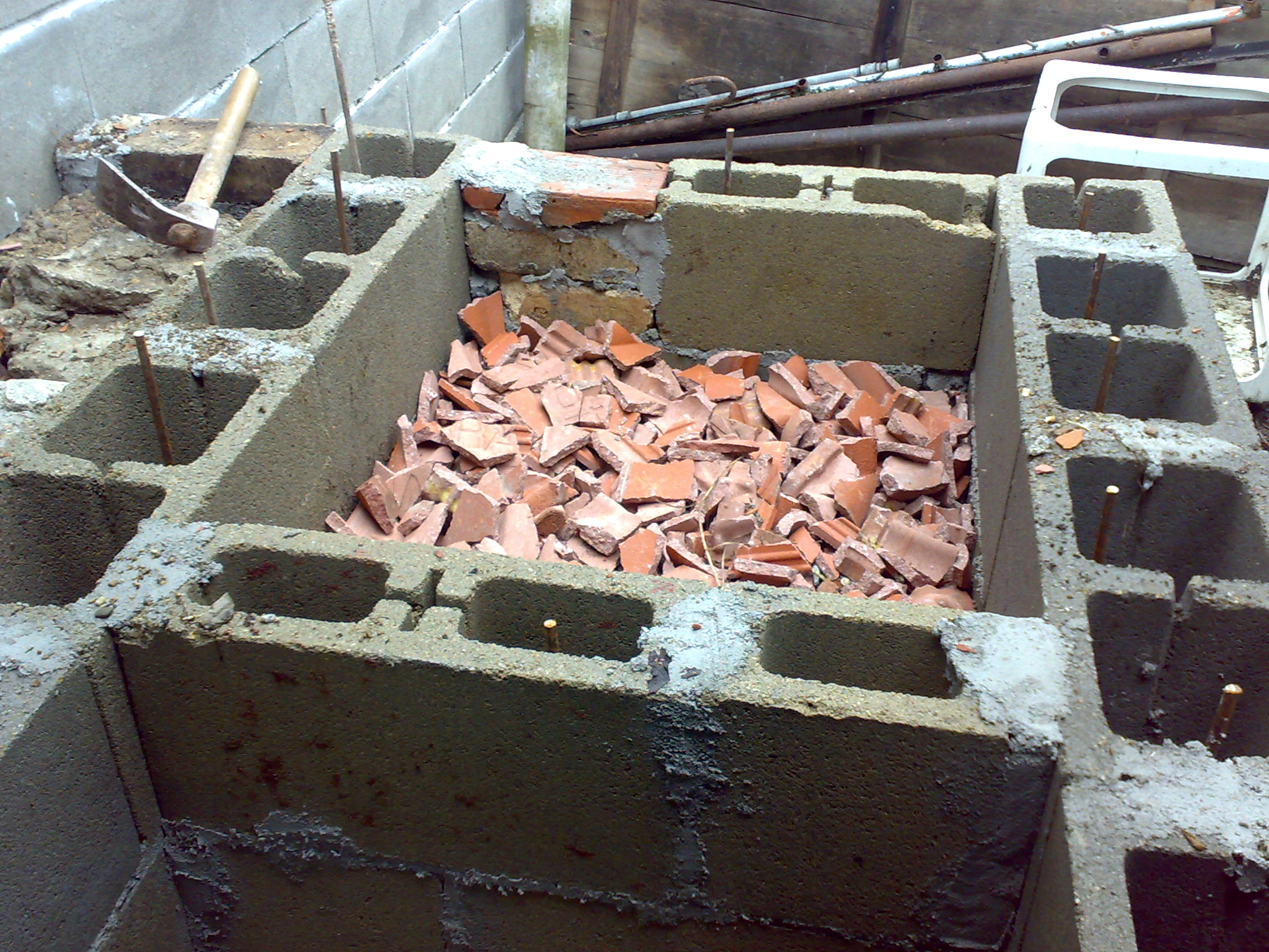 Дъждът ми обърка плановете, нооо пак си насмогнах :) . Комшиите имаха доста керемиди и ми помогнаха с пълнежа. Натроших ги и почти на 50 см дупката е пълна с керамика. Догоре напълних кухината както ме посъветвахте с пясък, натрошени стъкла, кварцов пясък и сол/около 20 см/ и почти съм готов с кофража. Остана утре/ дано не вали/ да армирам и другата седмица ще леем бетона.