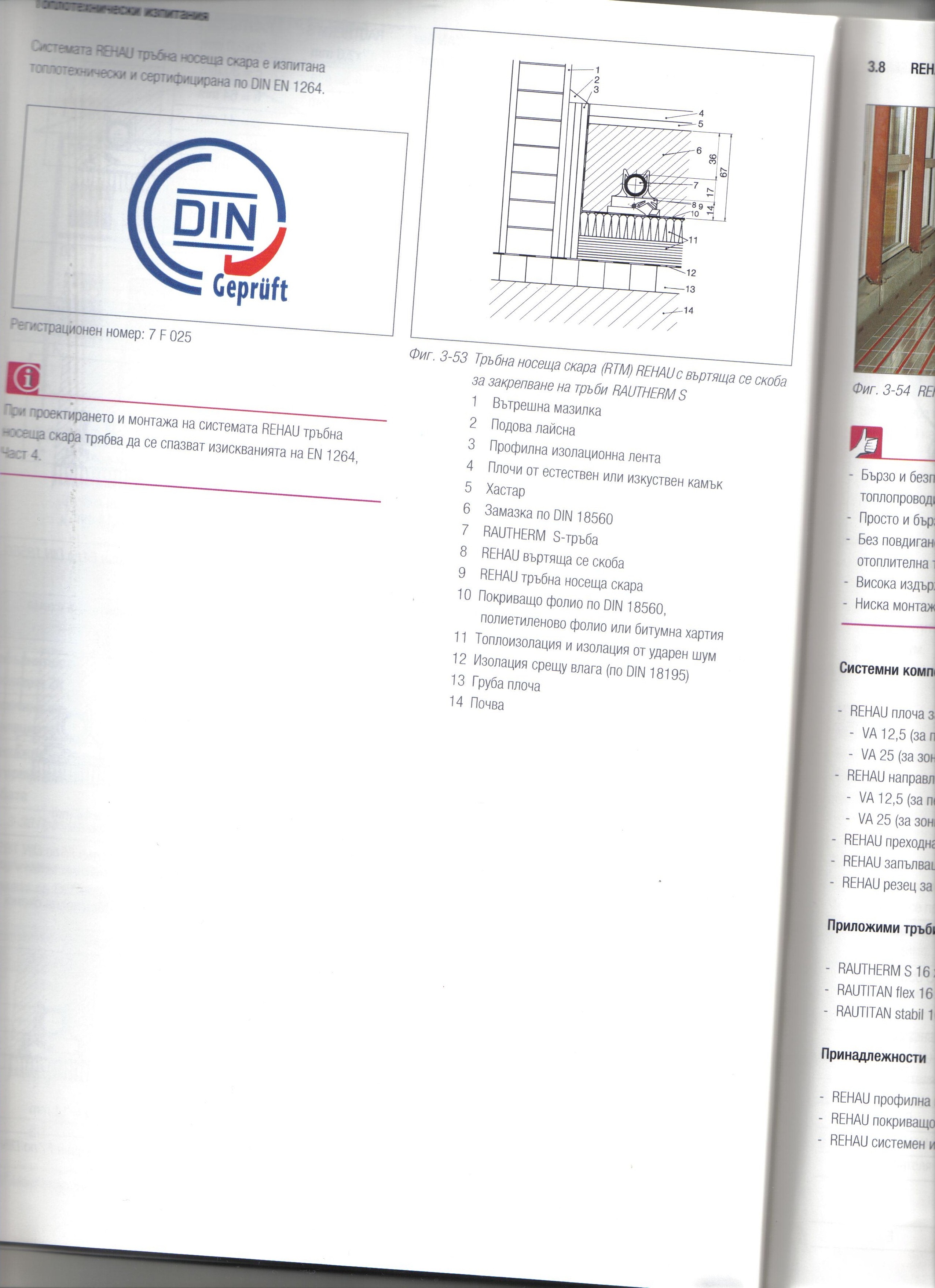 Вярно е, че фирмена техническа литература и технологични инструкции няма как да попаднат в учебно заведение и да служат за подготовка на студенти за бъдещи инженери, но това не омаловажава тяхното значение. Дори напротив - те са предназначени точно за завършили инженери, за използване реално в производството, строителството и т.н. В учението грешките не са фатални, но в реалния живот са недопустими. Например Техническото ръководство на Рехау, което сканирах е 200 страници само за подово отопление, където освен каталога на фирмените продукти има много схеми, чертежи, таблици, диаграми с указания за проектиране, монтаж, изпитване, експлоатация, сервизиране. Много от сериозните фирми също предоставят богата фирмена документация за ползване, организират безплатни или платени обучения, редовни семинари за запознаване с новостите. В нашата област знаете - Висман, Грундфос, Юнкерс-Бош. Нормално е да има разлика в някои детайли в различните източници и излишно е да се спори кое е правилно, защото 1-2 см разлика например в замазката за която стана дума не са фатални и не е грешка нито по-големия, нито по-малкия размер, зависи какви са целите. Както казахме по-дебелата замазка носи по-голям комфорт, но е по-инертна. Инертността пък в някои случаи е търсена в други случаи е нежелана. Затова не е добре да приемаме указанията в някой справочник или учебник за догма, а да разсъждаваме и да ползваме тази информация творчески - какво губим и какво печелим ако намалим или увеличим някой размер, някоя концентрация, някоя гъстота, някоя бройка. Ето например сканирах още един случай от ръководството на Рехау - този път не с изолиращи плочи, а със скара от 3мм стоманена тел. Вижда се, че има 1см разлика от предната, която постнах. Добре е за всеки специалист да има информация от повече източници и да я прилага творчески. От друга страна пък използвайки определена фирмена система е добре да се придържаме възможно най-близко до изискванията на тази фирма, за да няма проблеми с гаранцията и да могат да се прогнозират получените резултати. Така, че смятам темата за много полезна за обмяна на опит