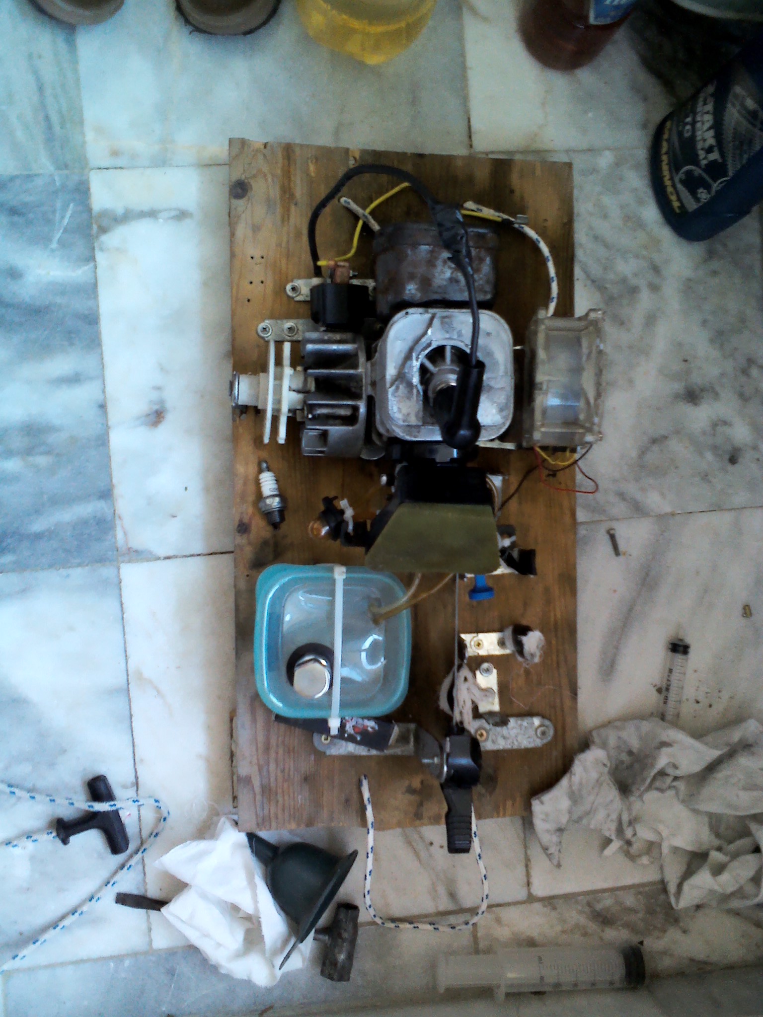 Напиши от каква резачка е мотора, че има хиляди видове. След това при сглобяването на дъската трябва да сте сигурни че няма нещо сглобено не както трябва и не смуче от някъде въздух / освен от филтъра/. Свещта работи ли / дава ли искра/ като е извадена, мокри ли се свещта от гориво в цилиндъра, с електронно запалване ли е или с чукче и наковалня, необходима ли е центровка и т.н.