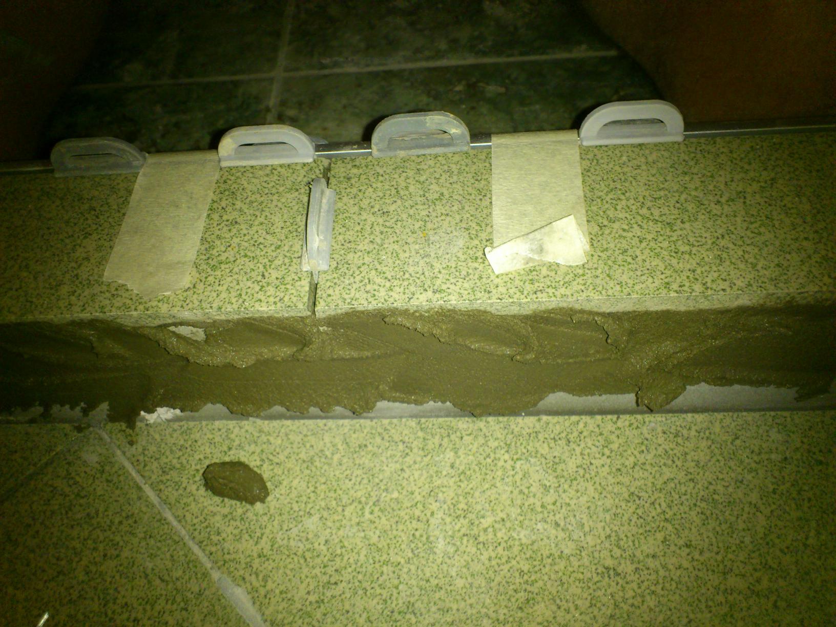Почва най-хубавата част - почваме да лепим парчетата за обръщане като слагаме дистанционери(в моя случай) или кръстачки между лайсната и плочките, хартиено тиксо е ясно за какво. Предпочитам този вариант пред плътно сложена лайсна по плочките, по-красиво и по-здраво.