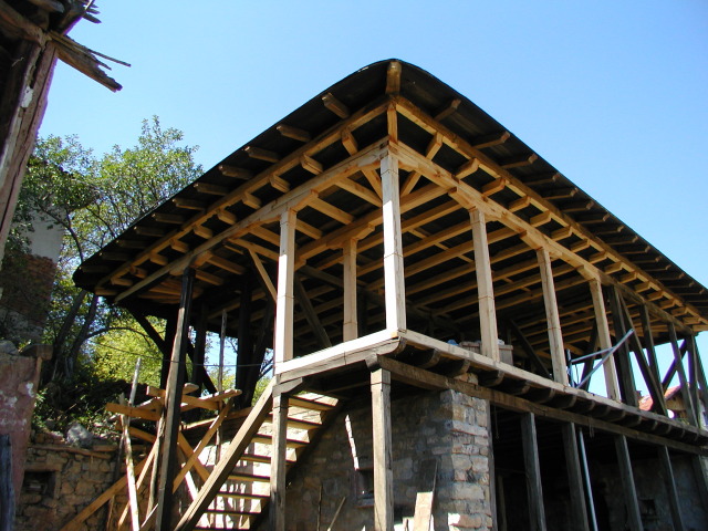 И така, тръгнах нагоре. Първо направих пояса от греди, в-у който ще стъпват вертикалите и паянтите. От долната страна направих фалцове, така че частично да застъпя дюшемето. Сглобките се виждат от снимките. Отново обилно използвах винтове за директен монтаж.