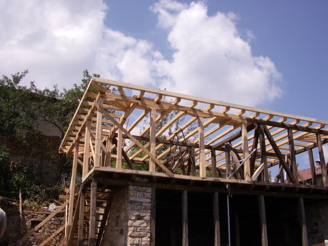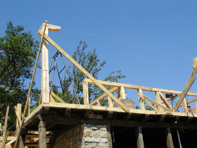 И така, тръгнах нагоре. Първо направих пояса от греди, в-у който ще стъпват вертикалите и паянтите. От долната страна направих фалцове, така че частично да застъпя дюшемето. Сглобките се виждат от снимките. Отново обилно използвах винтове за директен монтаж.