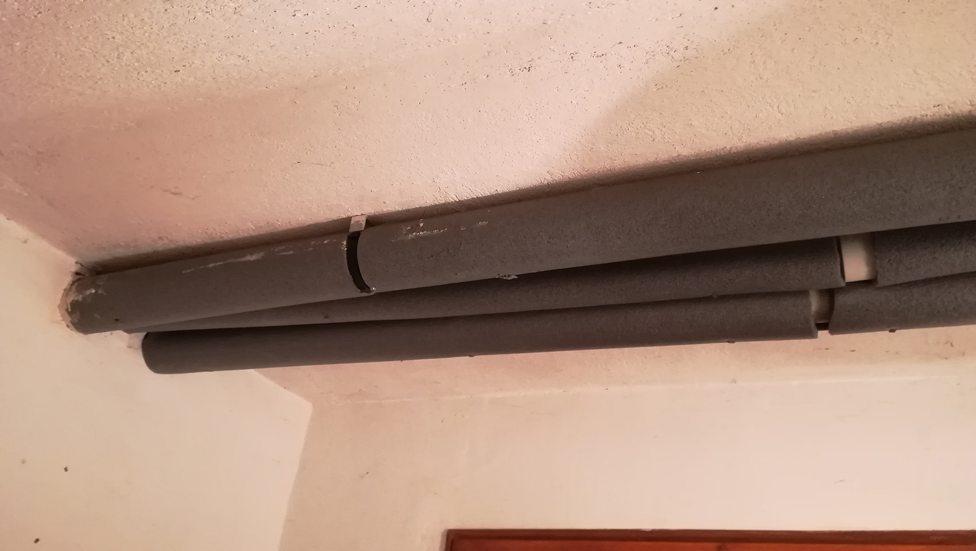 На тавана имам тръби от инсталацията на слънчевия колектор и се нуждаят от изолация. Част от водата не влиза в дреин бек съда и е рисковано да я оставя така незащитена.
