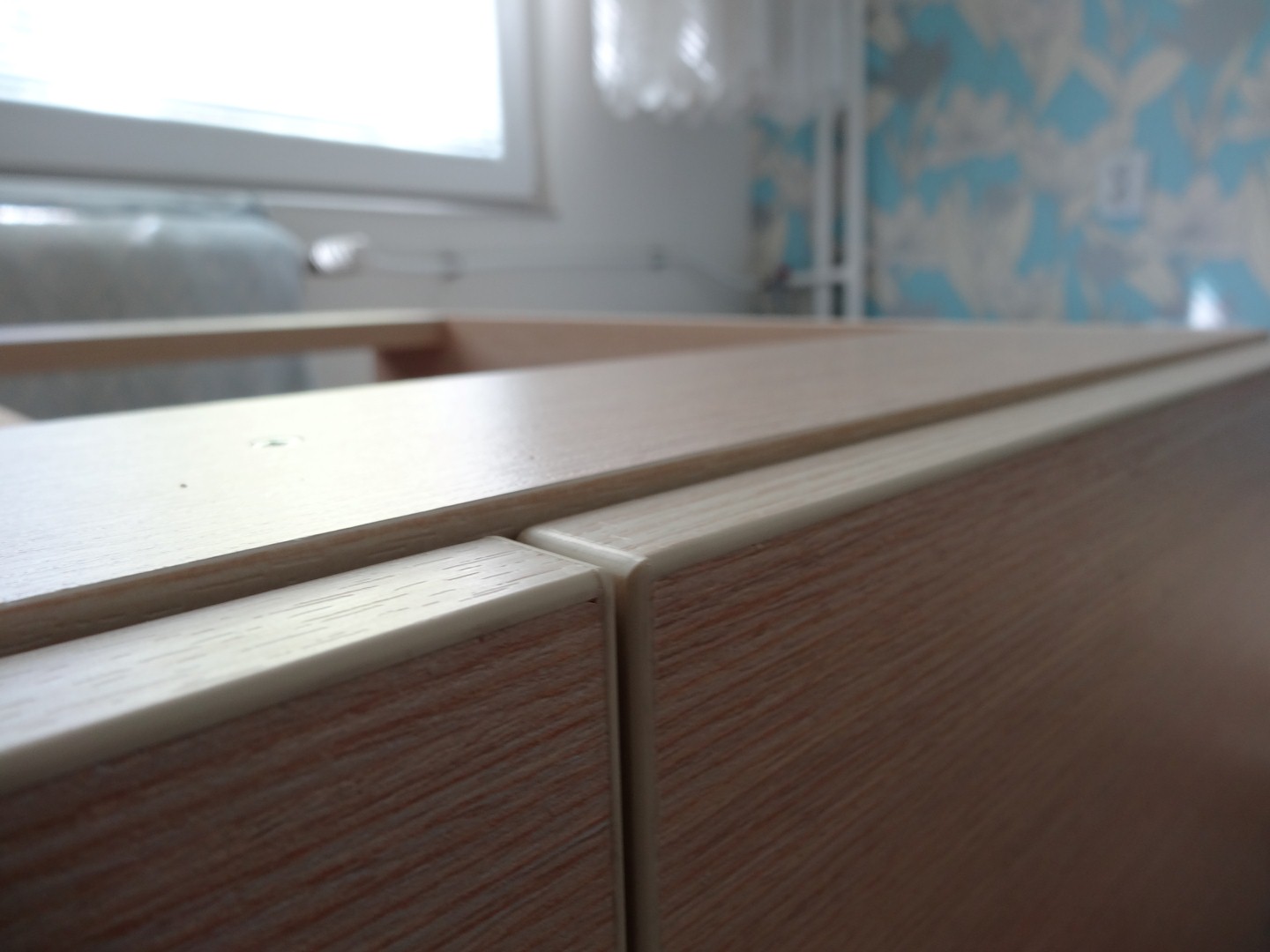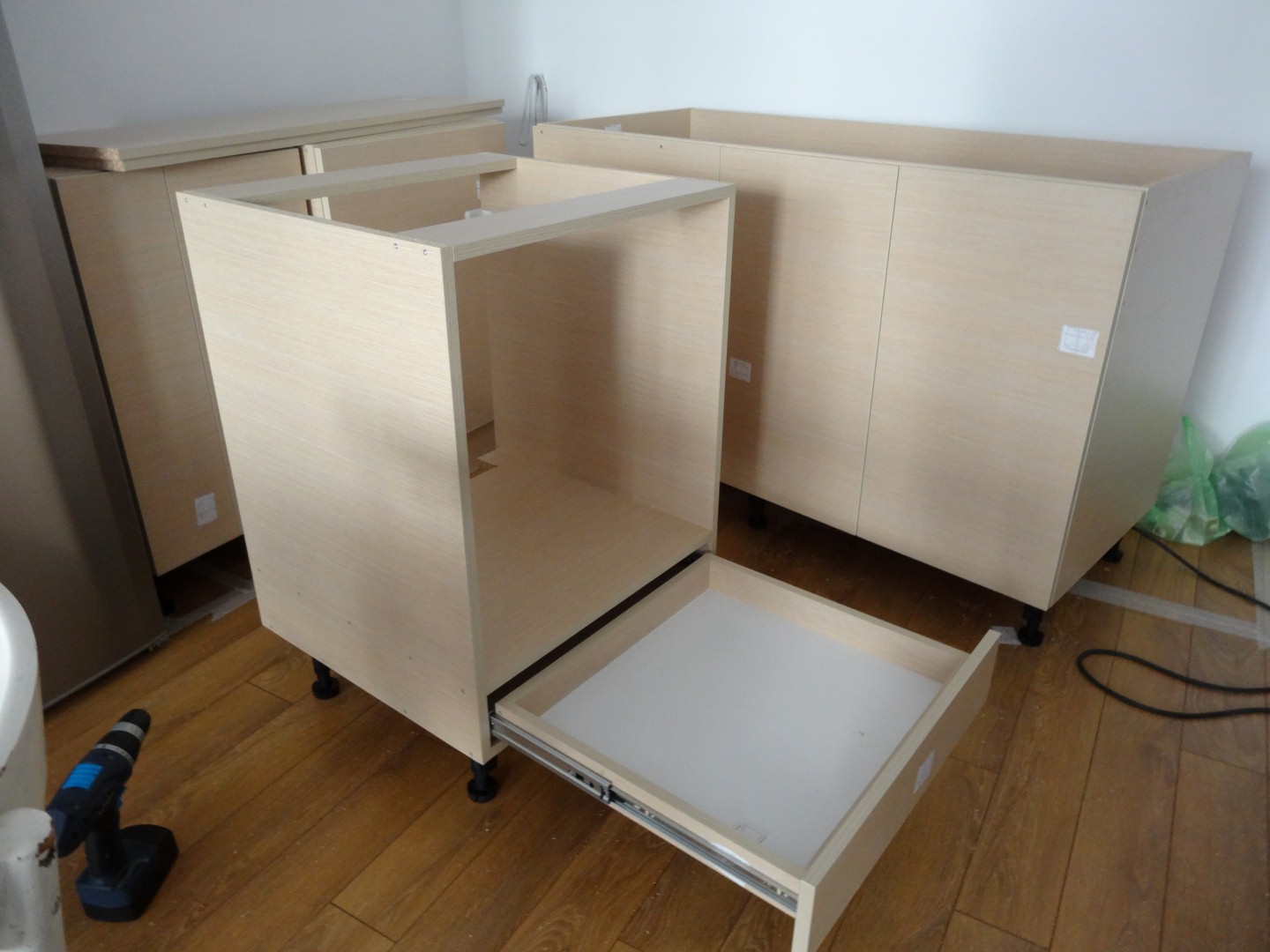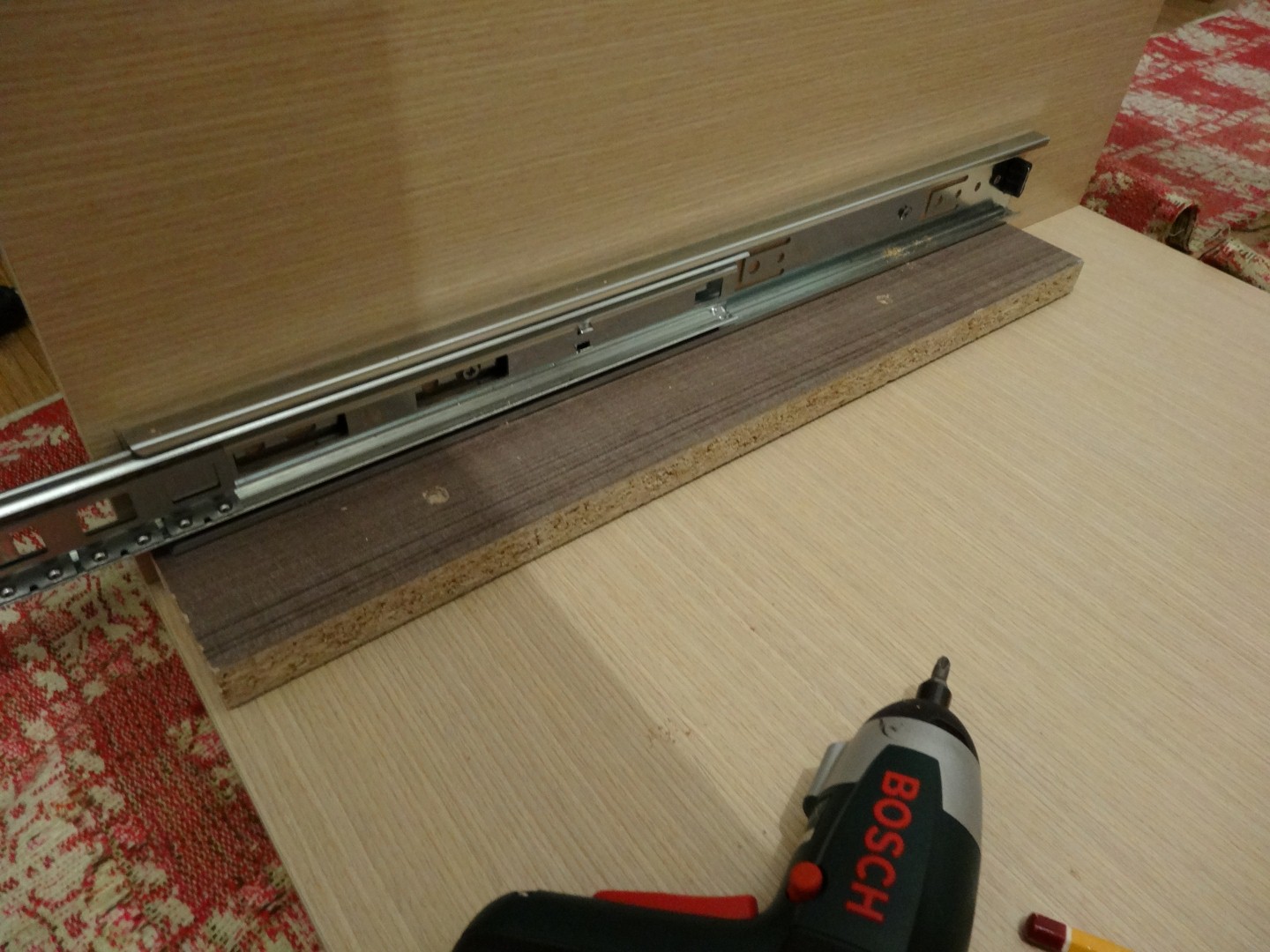Цената беше около 700лв за труда + материалите. Ако някой иска мога да снимам по-точно разписката за да се ориентира. Обкова, който избрах бе на Häfele - панти ЗК и ПЗК на клипс и плавно затваряне, няколко за челен фриз и три за високия шкаф с по-голям ъгъл на отваряне. Водачите и механизма за бутилките са от Роси. Всякаквите видии, дибли и разни такива също. Излиза доста по-евтино да се вземе кутия с видии от тях и да ви остане от колкото да ходите по кварталните железарии. Корпусите ги сглобявах с дибли плюс видии 3.5х50, а гърба с 3.5х16. Разпробивах тук таме с 2mm свредло по корпусите, не знам дали имаше нужда или не в крайна сметка