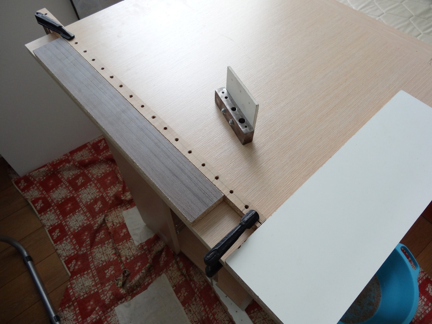 Предвид това, че всичко сглобявах сам си взех една от тези ъгловите стяги от Praktiker, свърши доста добра работа и помага при подобни индивидуални своеволия, цената й беше 13-на лева. Шаблона за диблите си го начертах сам и дадох на един фрезист да ми го направи... В последствие видях, че в Praktiker имат шаблон на Wolf нещо си, та може би беше безсмислено да търся фрезист ама карай