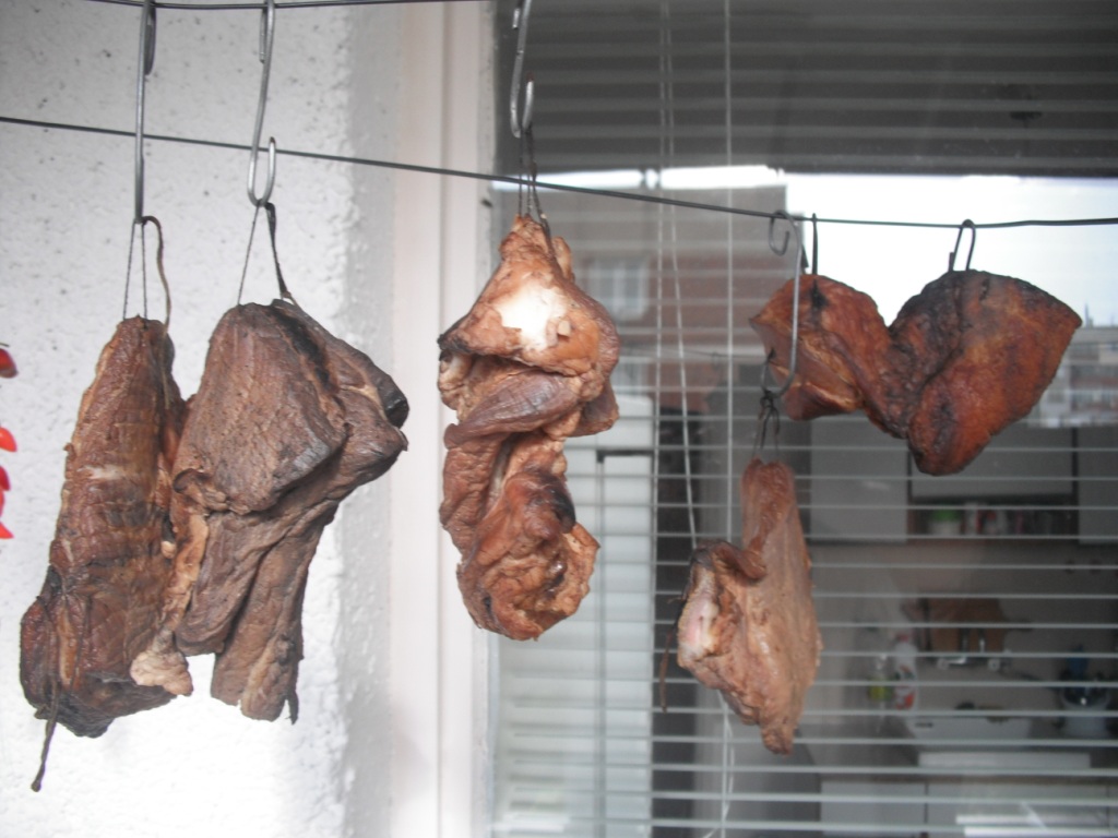 Да обесня защо се реже на такива ленти,че навярно се питате... за да може по-лесно да се работи при осоляването и най-вече при опушването, защото месото се слага във варел,а ако са къси парчета...ще се събере много малко на единица площ.