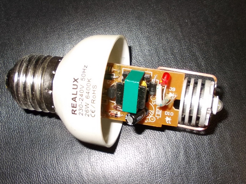 Днес правя експеримент с един от тези светодиоди http://shopping.windsolarhydroenergy.eu ... 220lm.html. Използвам фасунга от изгоряла енергоспестяваща лампа. Старо импулсно зарядно за GSM, което дава 5 V и около 800 mA. На светодиода му сложих допълнителен радиатор, след 15 мин. светене, нямаше особено затопляне. Да кажем около 30 - 35 градуса. Сложих готовото "изделие" на мястото на една от лампите в работилницата ми за проба (Снимките са от там)!!!