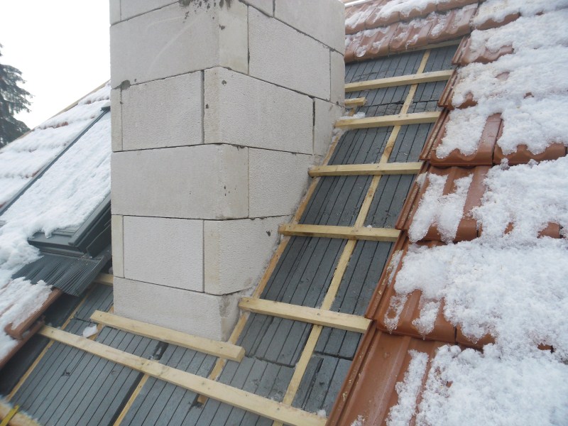 Всъщност комина е вентилационен. После топлоизолация и мазилка. Под керемидите е фибран, както посочи правилно колегата "jekasus".