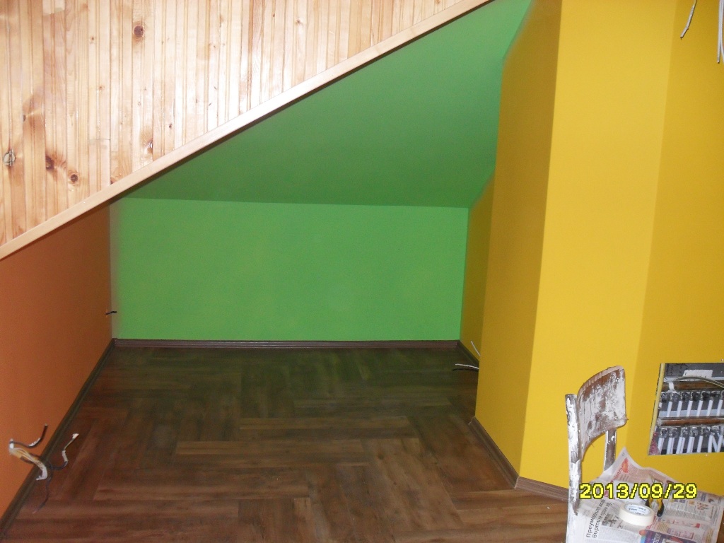 През 2011 започнах и не бързам много(ще бъде детска стая,детето е на 5).Повдигнат покрив,преграден на две таван,санитарен възел.На покрива 15см. вата ,в стените(от картон) 10см.На пода 5см. фибран и подово отопление.