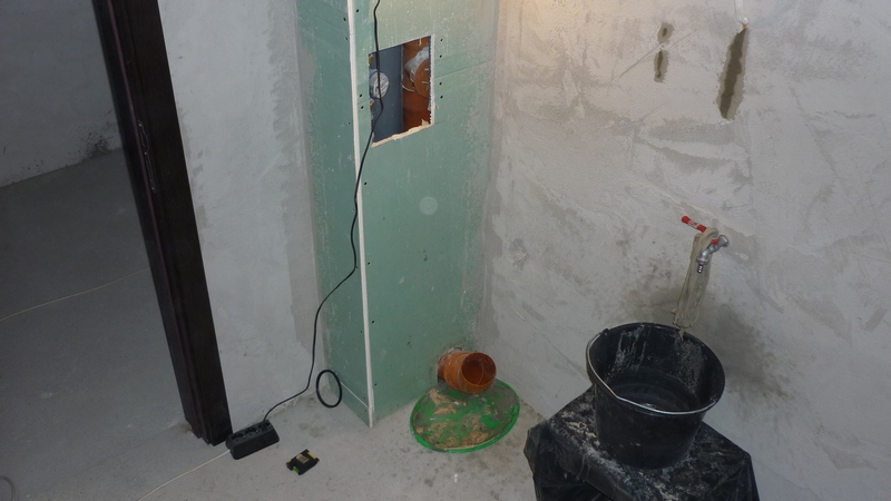 Снимки на банята. Стената на среща е бетон и е носеща, затова и тръбите не са вкопани, вижда се канала за душ кабината, които няма сифон и тръбата за мивката.