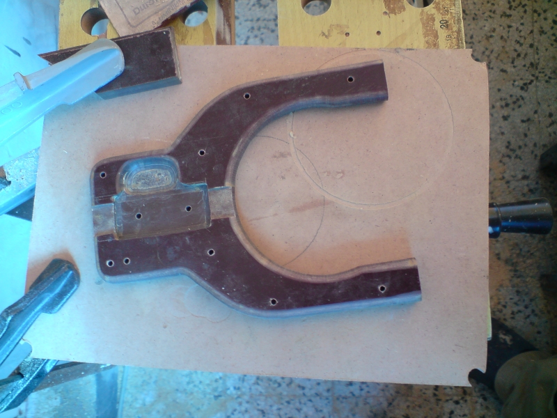 Имах лист гетинакс 6мм, видя ми се тънък и заготовката я залепих на два пласта с епоксидна смола. На шублера изрязах всички части, които стърчаха, оставих само нониуса и стопорното болтче. Използвах и новото кръгово приспособление, за такива дребни работа тази фреза е перфектна. Заготовката я лепих с двойно лепещо тиксо, нямаше място за стяги.