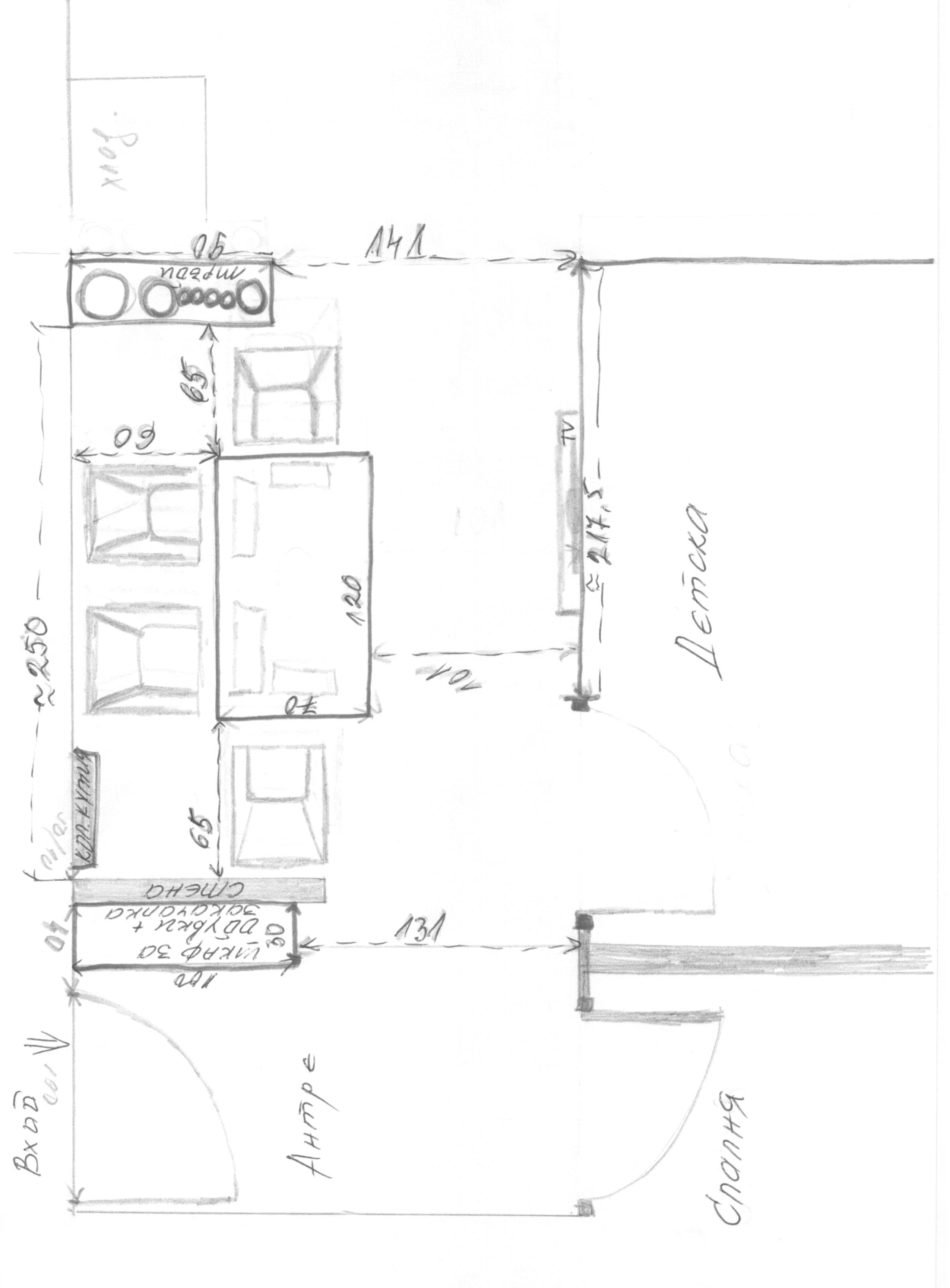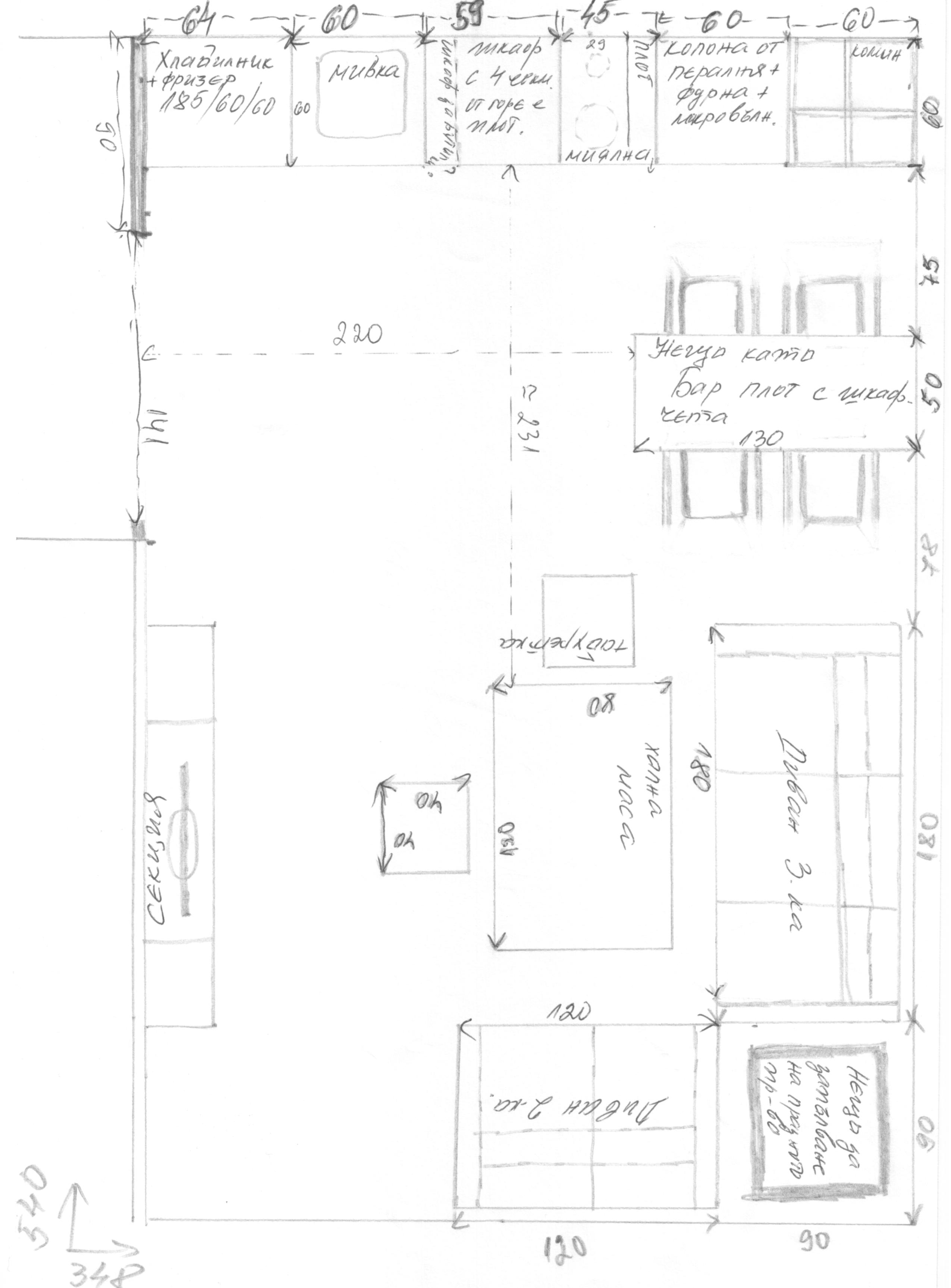 За кухнята да обесня, започва с колона - хладилник, и над него 2 шкафа, после мивка и под нея шкаф, малко шкафче за бутулки /евентуално ако има място/, шкаф с 4 чекмеджета, отгоре на плота двойка котлони, а от долу миялна, остава малко плотче между колоната на фурната, и последно една колона с най-долу пералня, после фурна и микровълнова, нагоре пак два шкафа. Над долния ред между двете колони с хладилника и фурната се слагат шкафове 3 реда. Над котлоните абсорбатор с издърпване. Точно до последната колона с фурната е комина. На вътре към хола е ясно нарисувано, като бара е с плот 50см/широчина, а отдолу идеята ми е шкафчета 30см дълбоки, ще се отварят с плъзгащи вратички от двете страни или само от към кухнята. Столовете са за бар, най-малко заемащи място. Другата идея е да не е бар, а тип маса, пак с шкаф отдолу, но да се ползва като за бързо хранене за нас и под плота да се направи още един плот който да се издърпва и да става една голяма маса.