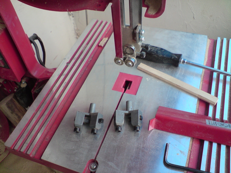 Абе аз се борих скоро със същия проблем и смених бакелитовите водачи с дървени/бамбук от клечки за ядене/, ама веднага почвам това с лагерчетата. НО не вдявам това ф 8 как е хванато за планката, на заварка ли - я разглоби всичките чаркчета и ги снимай заедно. И вземи ми направи едно блокче, квадратче да замени това червеното точно в центъра на масата, щото естествено, че е криво и когато режеш нещо малко, детайлът закача ро ръбовете - гледах го ама ме дразни и ме мързи да го направя от дърво :rolleyes: Купих ленти от Габрово, доста дебели - 0.6 мм и ми казах, че се пукали, щото е малък диаметъра на колелата, ама аз пробвах само че режат яко, но не съм ги експлоатирал та да видя дали се пукат. Довечера ще пусна линк, щото са и евтини.
