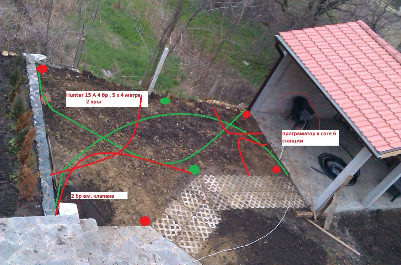 Имам една градинка правоъгълник 5м. на 4м. Имам и три разпръсквача Hunter PS ULTRA 10см + дюза 10 А червена R= 3.0 m.