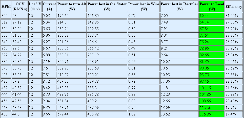 Понеже не ми се смята на ръка ще използвам таблица, която казва всичко. Въвел съм следните данни, които ти даваш 300 оборота, 28 волта и 5 ома: Резултата е бих казал доста мижав, особено по отношение на КПД (Efficiency) за размерите на генератора, който си направил и основната причина е в малкото количество магнитен материал (неодимовите магнити) само 35 куб. см. и другата причина е, че нямаш добро затваряне на магнитното поле. Не случайно на аксиалните генератори с магнити само от едната страна на намотките, слагат само железен диск без магнити от другата им страна, като се стремят дебелината на статора да е минимален. Като гледам в клипа, генератора е сложен върху седалката на стол, това предполага диаметър около 35 см.
