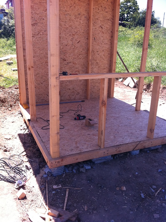 Мисля пода да го направя по следния начин. Да заравня земята, след това да положа тръбите за мръсния канал, да сложа палета и върху тях за закова ОСБ. И това нещо да го ползвам за под, върху ОСБ-то ще сложа балатум. И след което ще се изграждат стените.