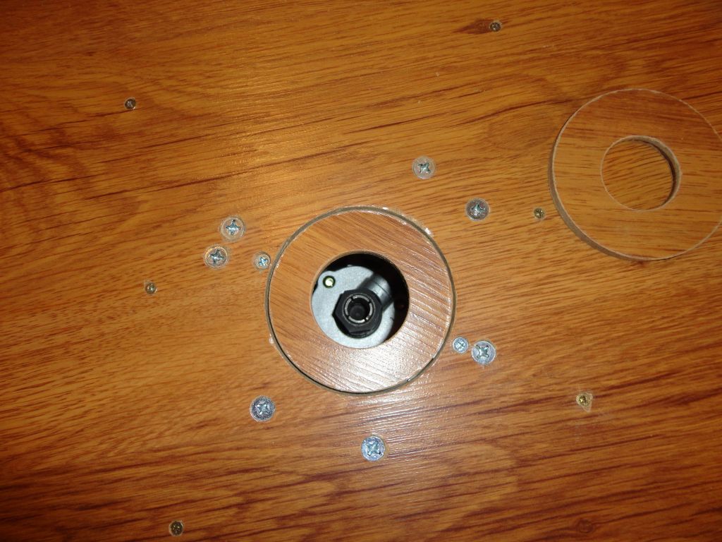 Както писах в другата тема, взех си една оберфреза 12,7 МАКАЛИСТЪР.Днес я монтирах на масата.Стана така, че може да се използва и РАЙДЪРА и новата фреза.Само се сваля едната и се слага другата.Ето какво се получи.Смених цялата горна основа, както предния път пак ламинат 8 мм.Прорязах основата 16 мм МДФ с профила на основата на фрезата.Отгоре се завива с 6-7 болта М 6, използвах фабричните отвори, но ги разширих до М6.Отвора на масата е 82 мм, да работи табления фрезер.После, за по-малките фрезери отвора се редуцира с няколко гривни.Те са закрепени за две П образни профилчета, хванати с болт М4 за ламината.Остава ми да пробия дупките на гривните и на П профилчетата за да закрепвам самите гривни да не мърдат Болтове М3 им стигат, но това утре вече.