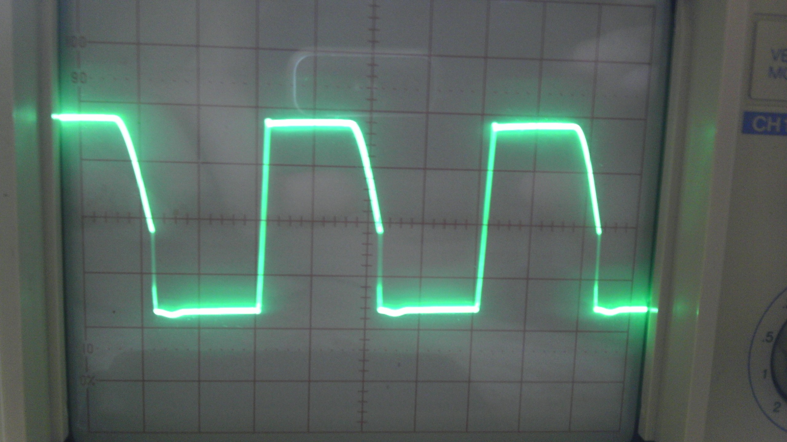 Да найстина съм объркал сондите,импулсите са еднакви на двата изхода на ТГР.Сложил съм на изхода на силовия траф диоди КД213А по два в паралел колко за проби,без дросела,но неполучавам осцилограмата на КЕ на силовия транзистор.Незнам откаде може да е проблема.Ето снимка на импулса.Подал съм 40в. на силовата час чрез латр.