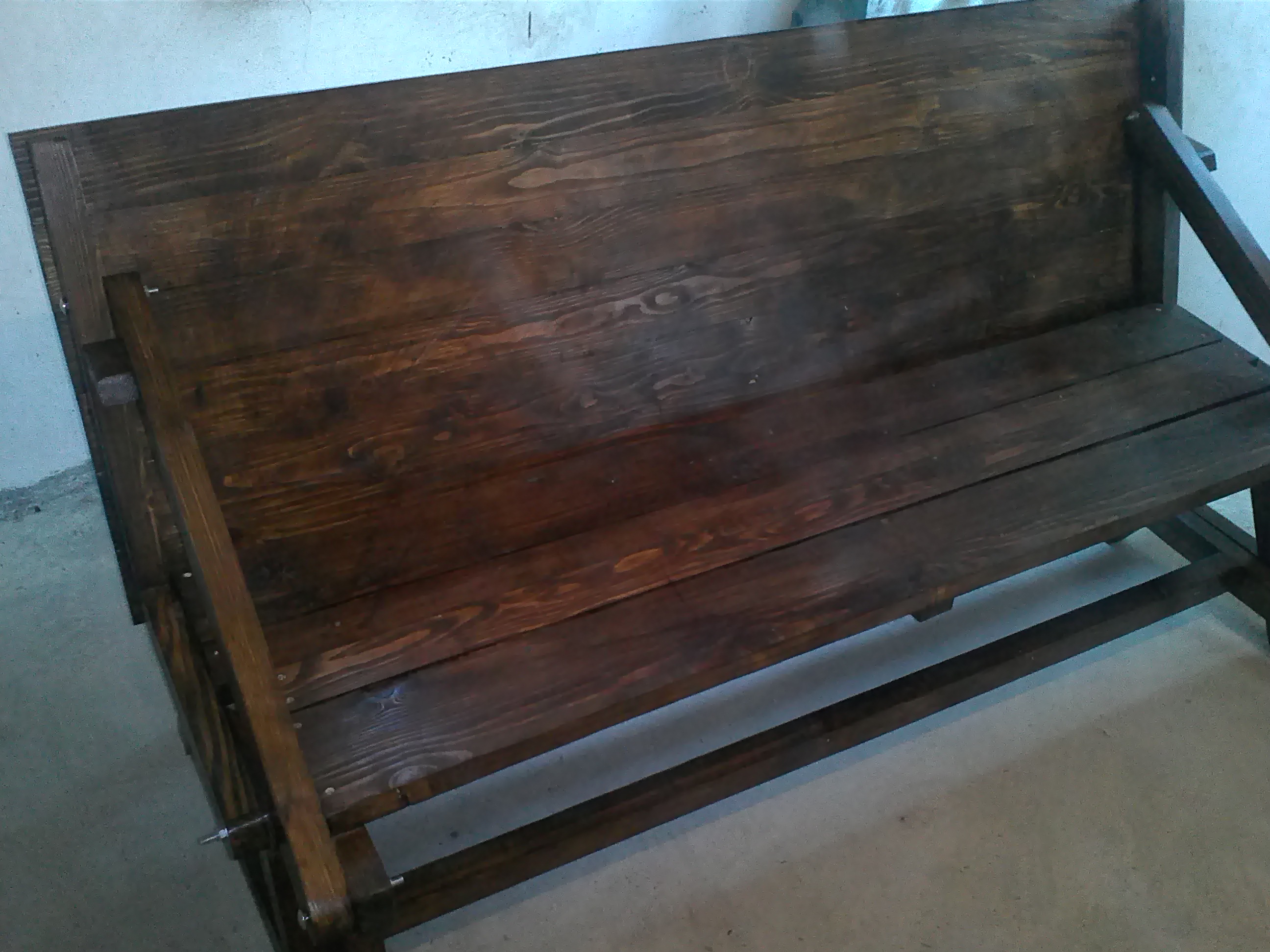 Мисля как да пригодя това вместо "пейка" да е легло. Един приятел има малка къща в гората и са му кът и леглата и масите. Седалищната част е ясна - двете по 40-45 см широки ще са достатъчни за легло. Дължина от около 2 метра за седалищните части пак няма да е проблем, но за масата не виждам как да предотвратя провисването. Освен с надлъжни царги и втори плот...