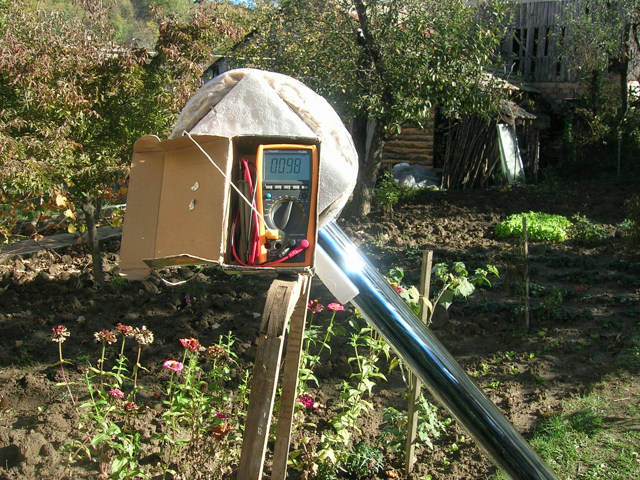 Резултата се оказа много добър: Получи се чудесна соларна фурничка, която е напълно безопасна, тъй като няма открити нагрети части и готви всичко на ниска температура. Засякох 130 градуса на празна фурна и 88 на пълна. Това позволява тавичката да се пъхне сутринта и вечерта в 21 часа да се извади гореща Експериментите с рагу и ориз за кучето бяха много успешни и преминахме към по сложни изпитания. Зрял боб реколта 2010г. Беше сварен чуддесно без да е преварен, а резултатите със джолан и цяло пиле надминаха очакванията. По крехко сготвено не съм опитвал: