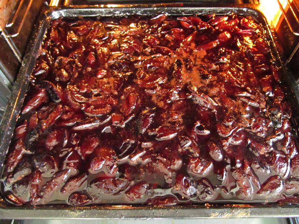 Измитите и почистени от костилките сливи се слагат в голяма емайлирана тава, посипват се със захарта и се оставят да престоят една нощ. Така сливите си пускат сока. На сутринта се пекат, докато сиропът се сгъсти (капка, капната върху порцеланова чиния, да не се разлива). При мен на фурна с вентилатор и 180 градуса към два часа грубо. Наръсват се с канелата, разбъркват се и се насипват горещи в сухи буркани. За разкош може да сложите и орехи на едро.