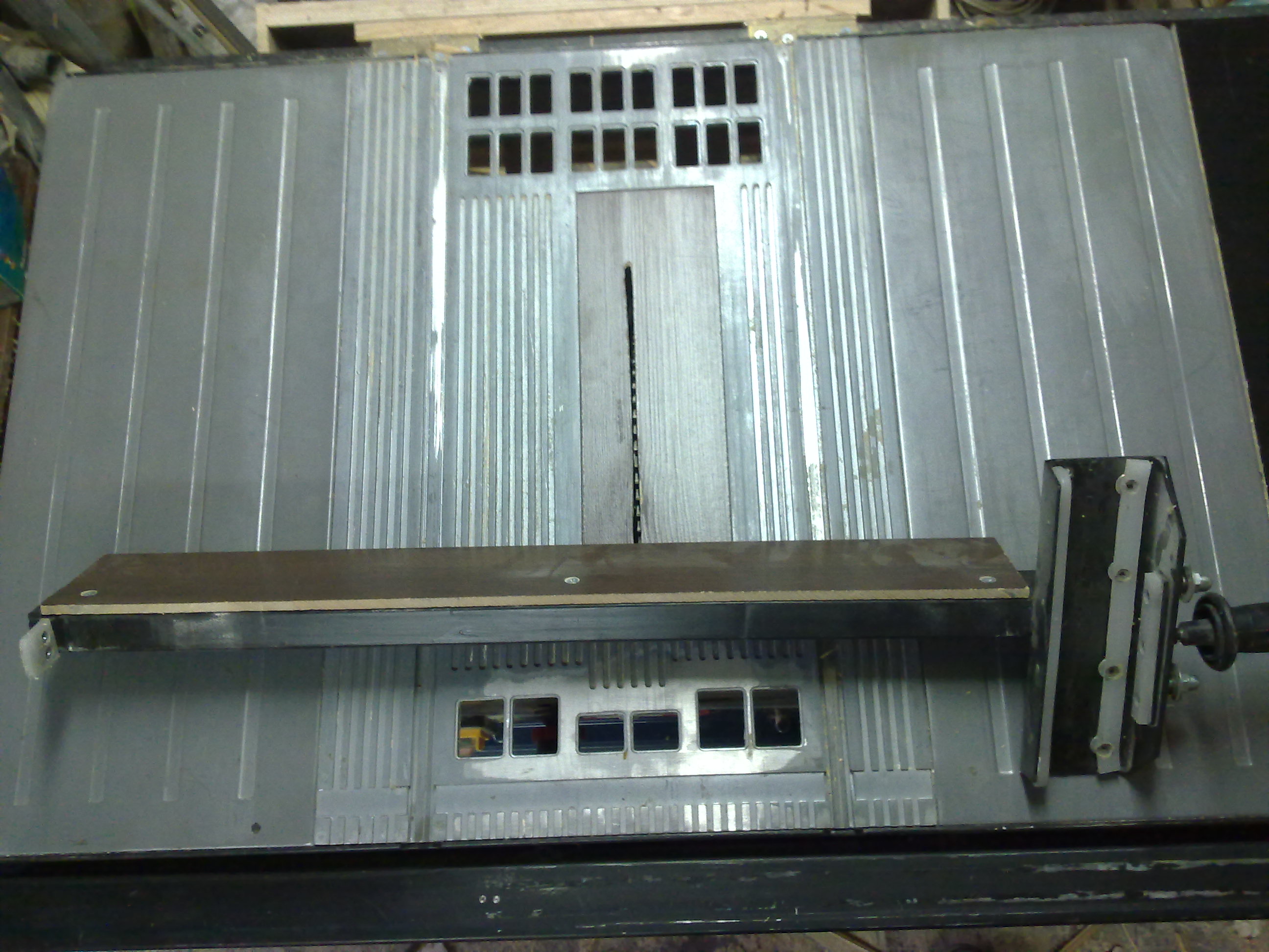 Направих предпазител за ножовете и остана една кутия да покривам диска. Монтирах и нов успореден водач от чугун, оригиналният е от тънка ламарина) мисля е от банциг. Разпробих старите отвори от М8 резба на М12 за да станат винтовете на водача, наложи се единият ред дупки да го преместя заради малко по късата му дължина. Същият водач става и за планята, но заварих още едно ухо по същата причина. Нищо общо няма чугунения водач с ламаринения, става идеален прав ъгъл, за разлика от преди. Накрая монтирах и колелца за по удобно местене. Двете са със спирачка за застопоряване. Това е от мен, някога може да направя нов раздвижен плот за напречно рязане с водачи от чекмедже, но не се знае. :-D