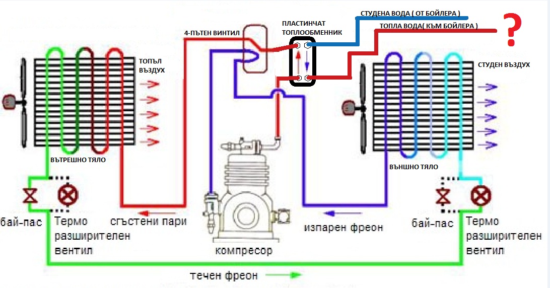 Извинявай, тази схема не съм я правил аз само съм я допълнил. Не е ли по правилно да хванеш топлообменника преди 4-пътния вентил, ако някой ден решиш да сложиш и вътрешно тяло (конвертор) за охлаждане???
