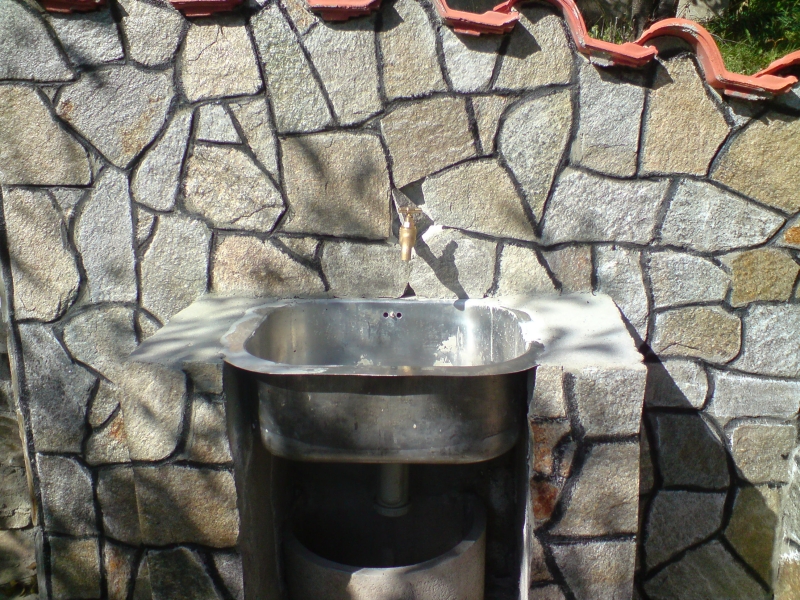 : пускам тука едни снимки от съботни заигравки на вилата. Чешмата и лепенето на основния камък не е мое дело за съжаление, наехме местна фирма. Аз довърших само плота за мивката и една дупка до чучура, че ги бяха оставили така, а ме дразнеха. Взех 4 плочи гранит от Баумакс за 4,50лв бр. За стабилност добавих отдолу и дървена рамка. Гранита го оставих да стърчи 1,5см извън рамката и нарязах канал за спиране на капката на 5мм от ръба отдолу на плочката с ъглошлайфа.